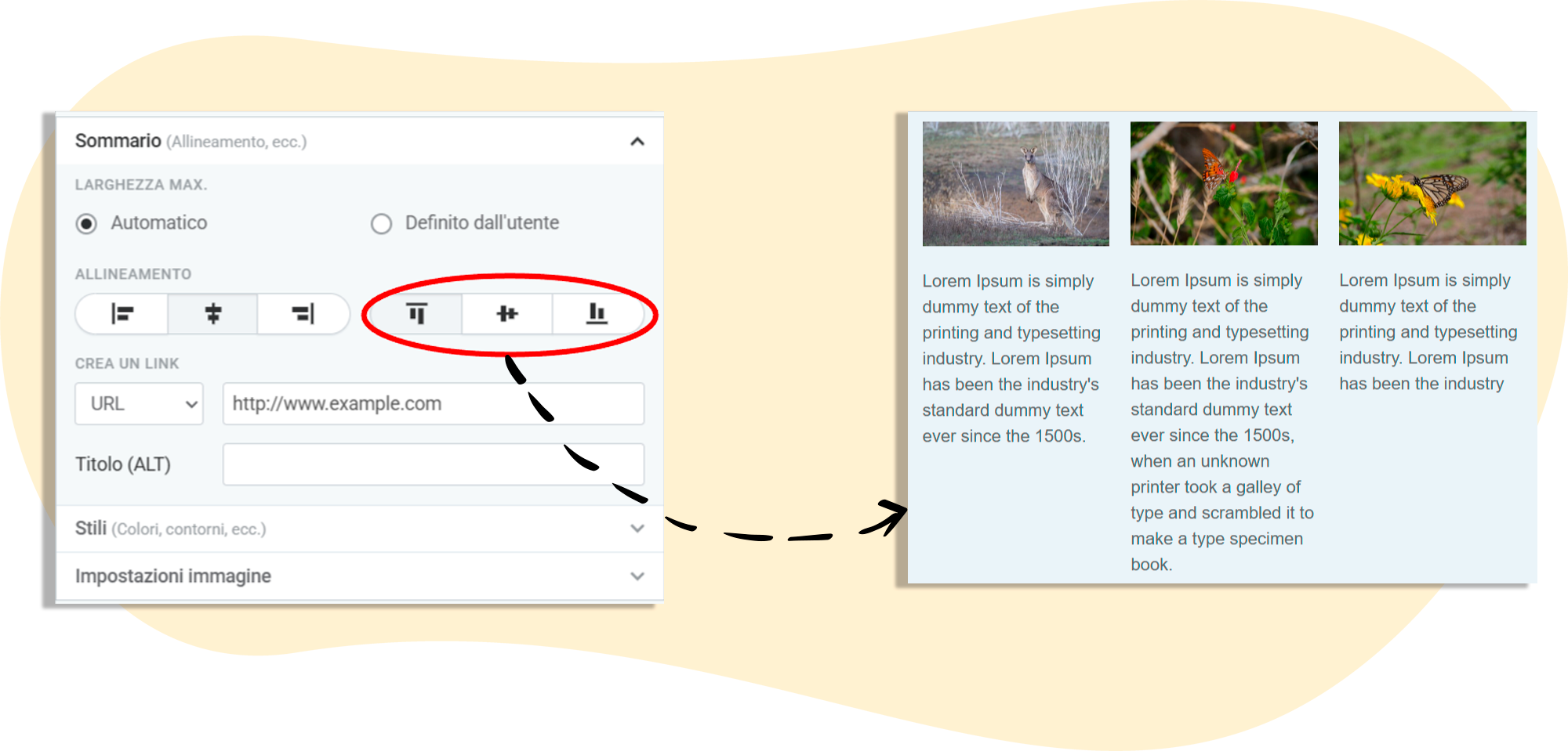 Se i testi sono della stessa lunghezza ma le immagini hanno dimensioni diverse, ti consigliamo di allineare le immagini in basso. Dopo aver trascinato l’elemento Immagine + Testo nell’editor e caricato la tua immagine, imposta l’allineamento dell’immagine (menu a destra) su basso nelle impostazioni dell’elemento. Applica la stessa impostazione a tutte le immagini.
