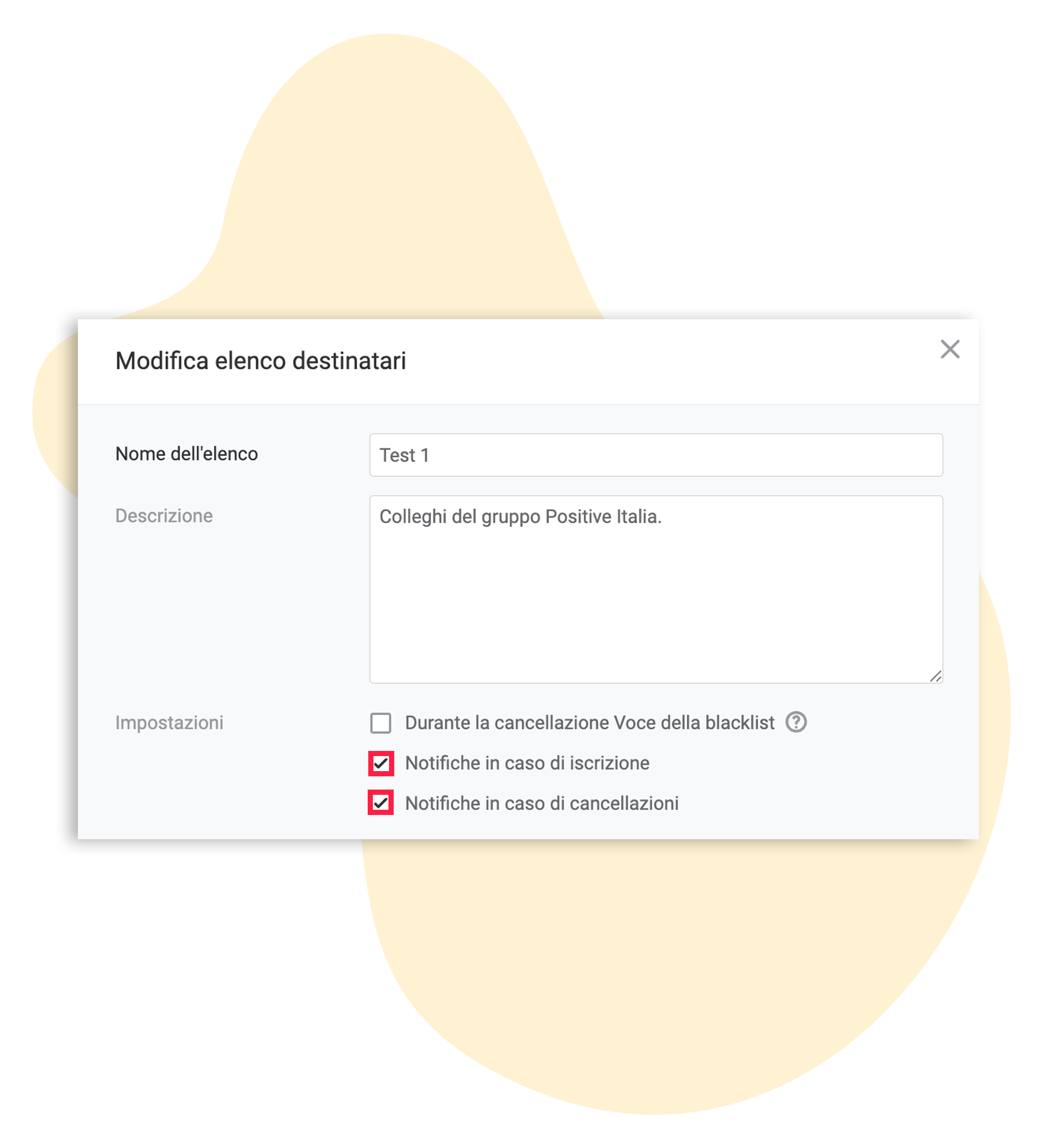 Conferma le modifiche cliccando su Salva. Da quel momento, riceverai notifiche via email in caso di iscrizione e/o cancellazione dei contatti da quella lista.