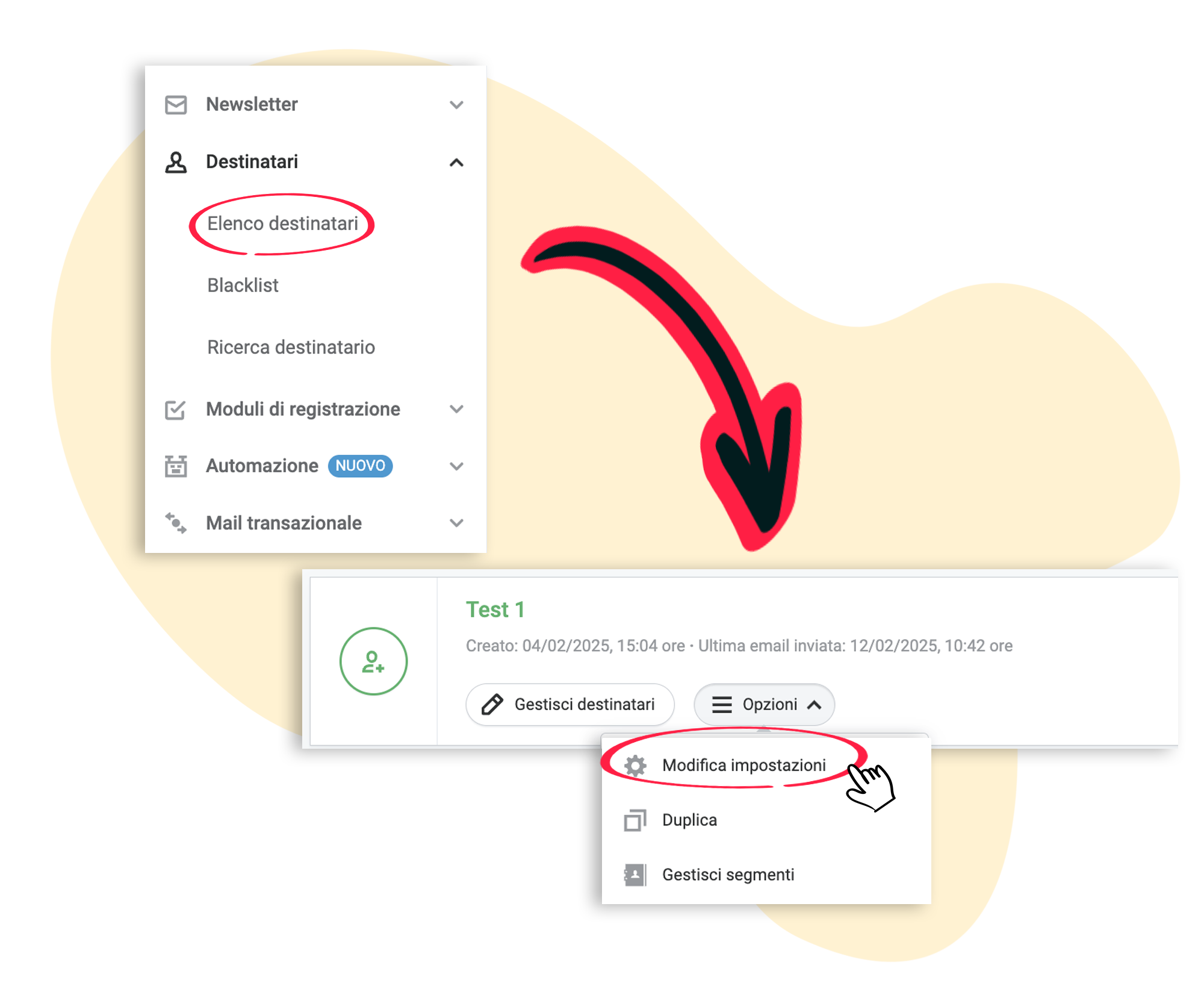 Clicca su Destinatari > Elenco destinatari, poi seleziona per la lista desiderata Opzioni > Modifica impostazioni.