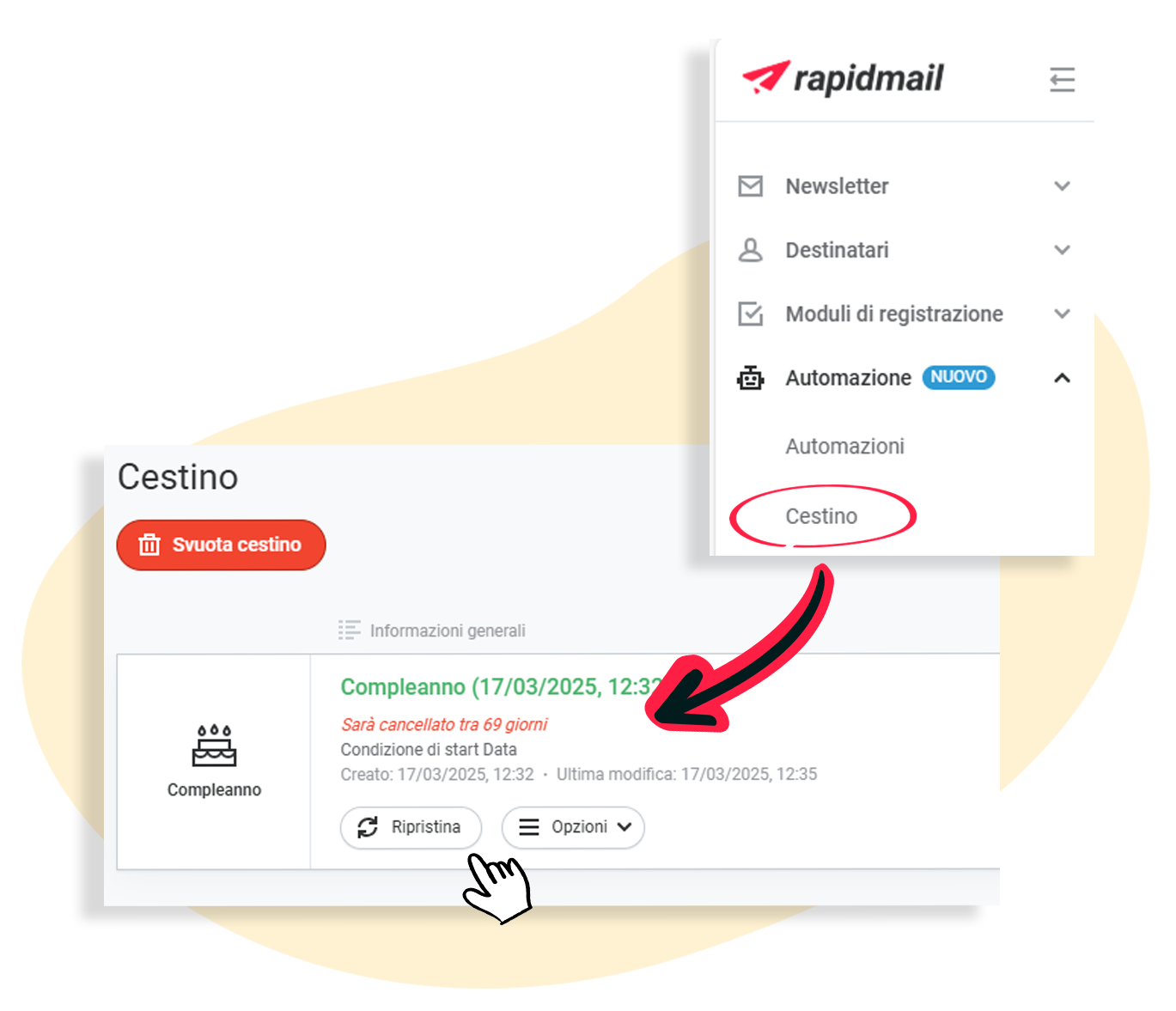 Il cestino si trova nella barra di navigazione a sinistra: Automazione > Cestino. Qui si trovano tutte le automazioni eliminate negli ultimi 70 giorni. È possibile utilizzare il pulsante Ripristina per riportare un'automazione nella panoramica.