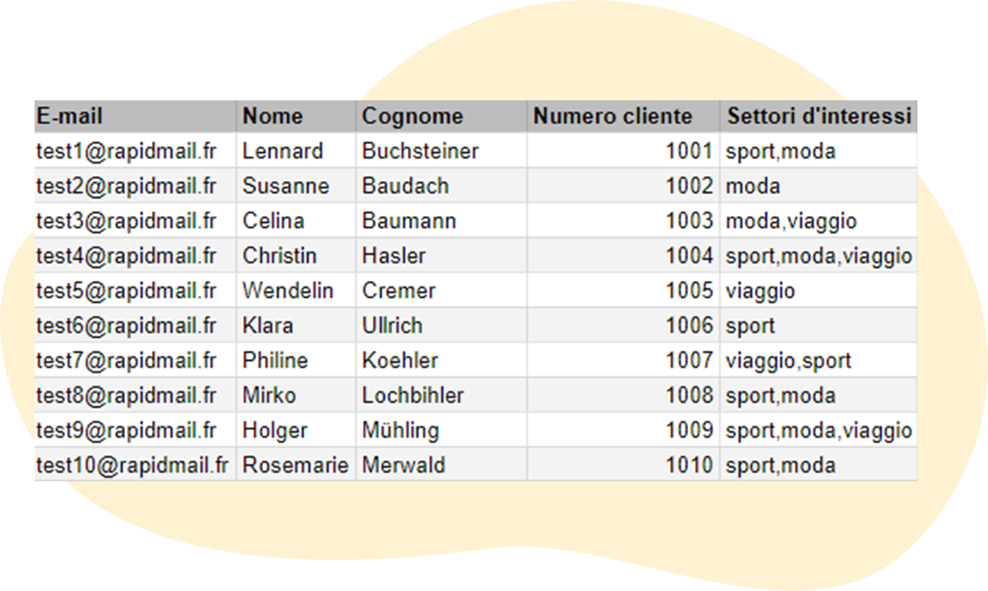 - consiglio: utilizza intestazioni di colonna (ad es. “email”, “nome”, “CAP”, …)