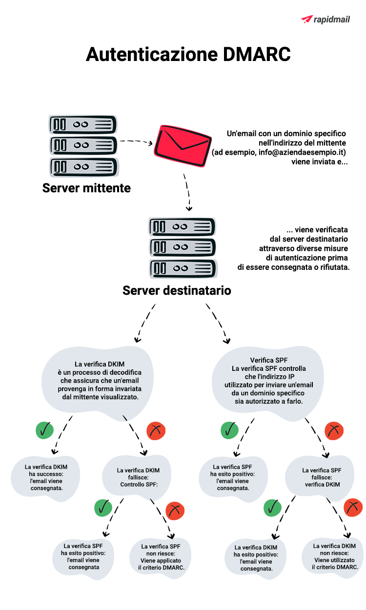 DMARC si basa sui metodi di autenticazione già menzionati, DKIM e SPF: dopo aver inviato un’email, il server del destinatario effettua un confronto in cui vengono verificati DKIM e SPF.