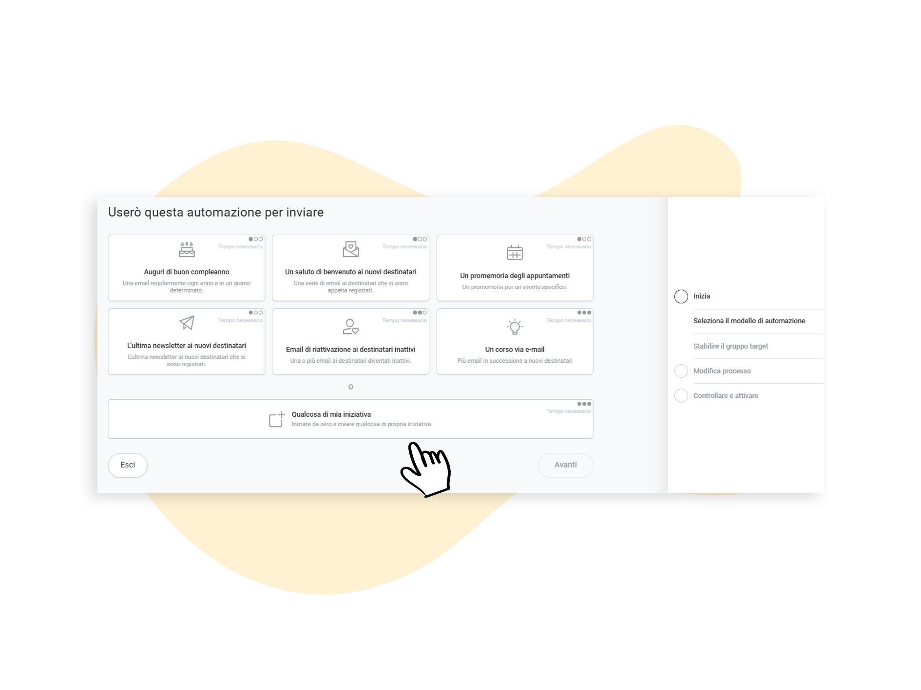 Per la creazione di una serie di automazioni puoi scegliere tra 7 modelli diversi: 6 con flussi già pronti e un modello vuoto che puoi progettare te stesso. Per ciascuno di questi flussi abbiamo preparato una guida passo-passo che ti aiuterà a configurarli.