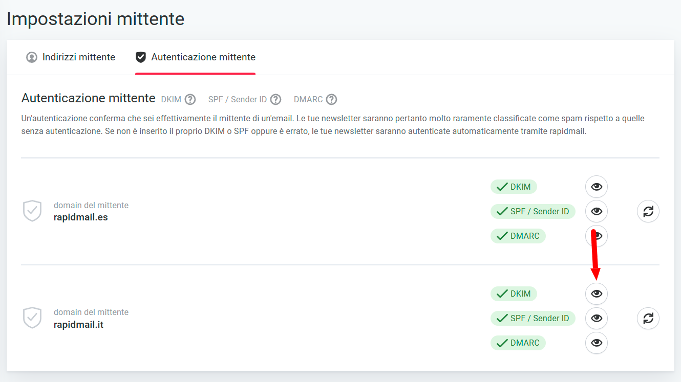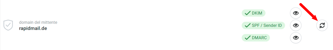 Nel tuo account rapidmail, clicca sull’icona di aggiornamento (refresh) che trovi a destra per verificare se il DKIM è stato rilevato correttamente.