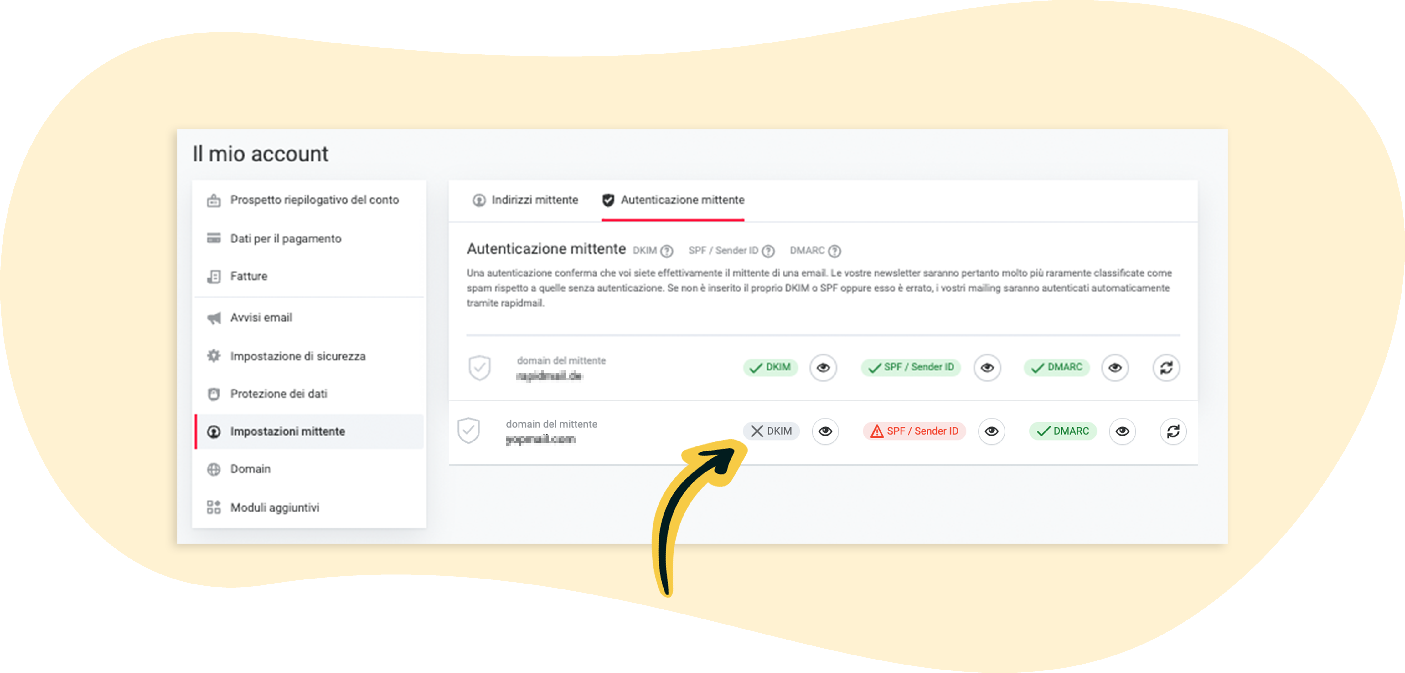 Troverai una panoramica dei domini del mittente e delle informazioni relative alle procedure di autenticazione eseguite per ciascun dominio. Nel nostro esempio, per il dominio del mittente dominioesemplificativo.de non è stata ancora eseguita alcuna autenticazione, mentre per il dominio del mittente rapidmail.de tutte e tre le procedure di autenticazione sono state completate.
