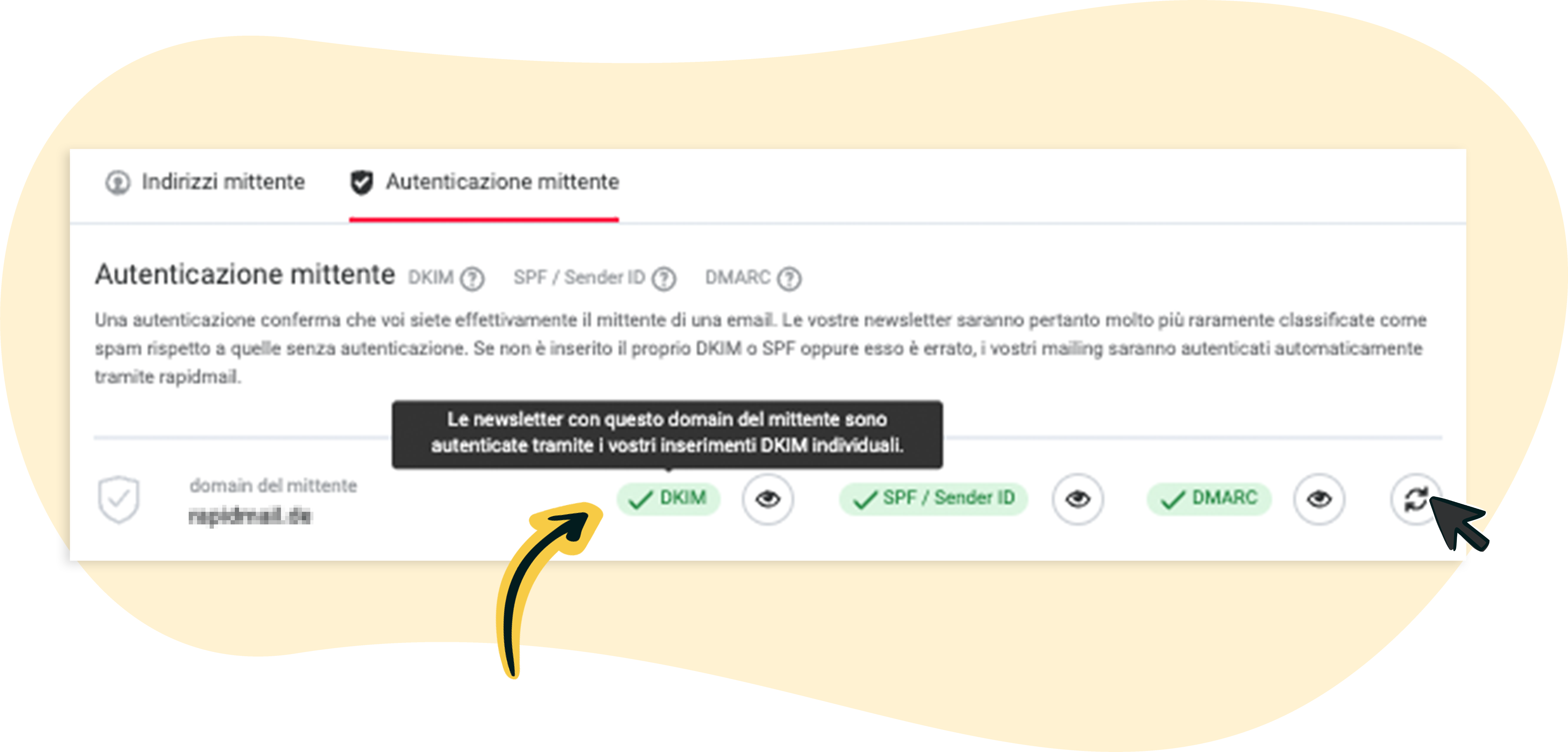 L’ultimo passaggio consiste nel tornare all’account rapidmail per verificare se tutto ha funzionato. Nella panoramica trovi un pulsante di aggiornamento (🔁). Fai clic su di esso per verificare se il codice DKIM è stato salvato correttamente.