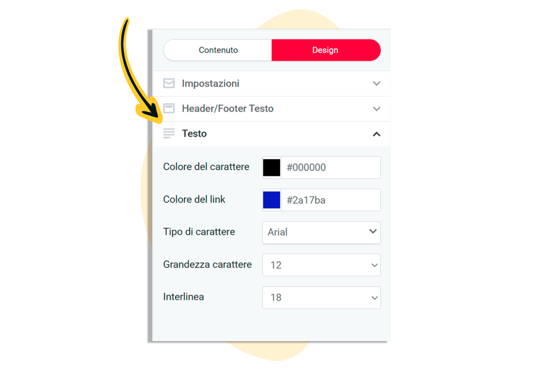 Nella sezione “Testo” puoi impostare il colore e la dimensione del testo, e il colore dei link.