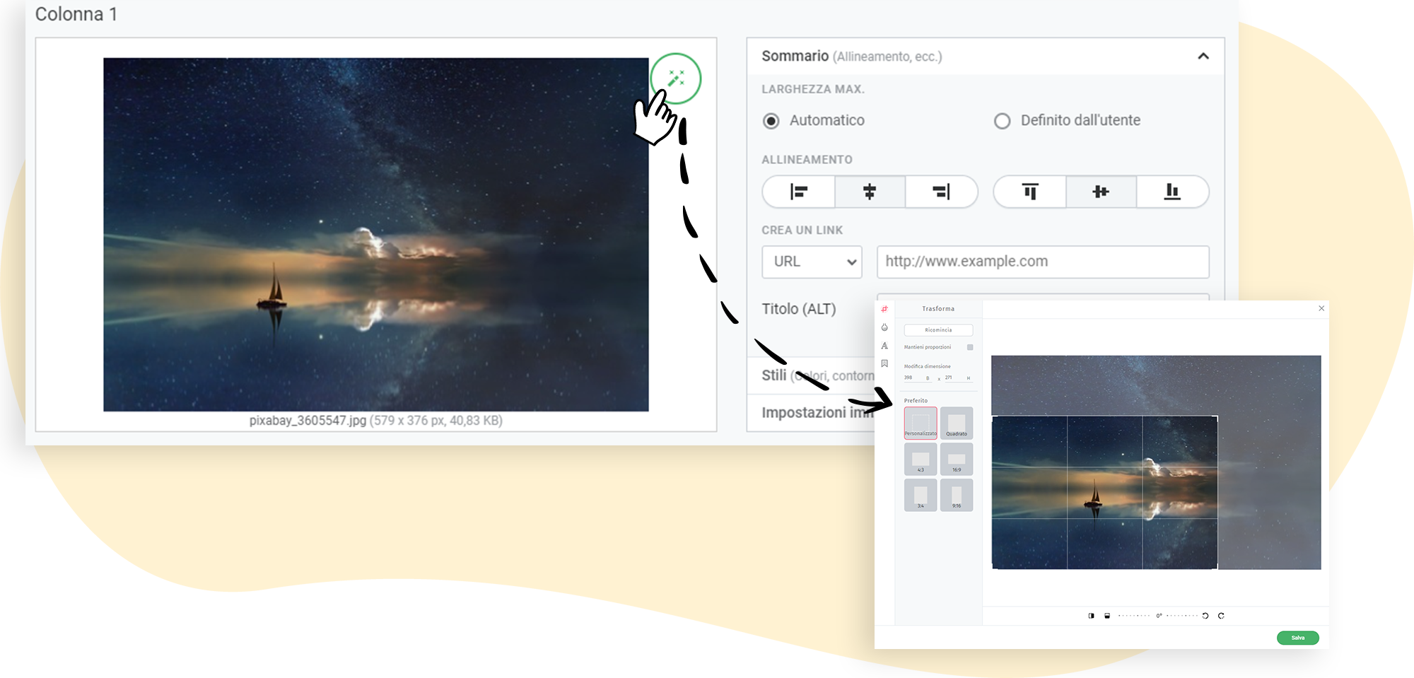 Per ritagliare le immagini nell’editor hai le seguenti opzioni: