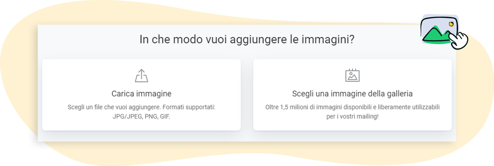Passaggio 1: quando inserisci una nuova immagine nella tua bozza di newsletter puoi caricare questa immagine direttamente dai tuoi file o utilizzare la nostra banca dati delle immagini gratuita.