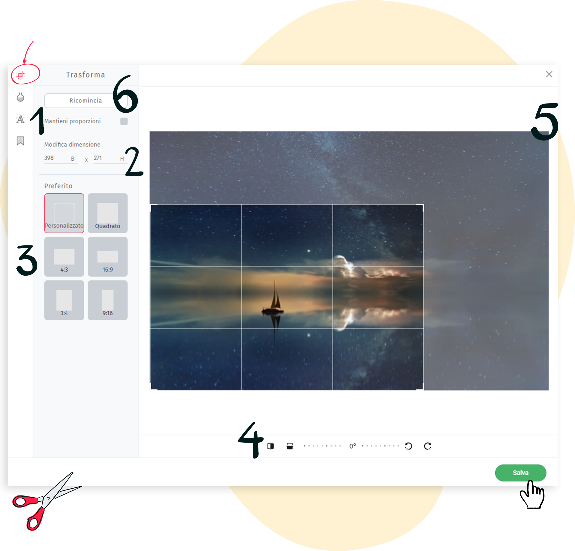 1: se vuoi mantenere le proporzioni del tuo file immagine, metti il segno di spunta accanto a “Mantieni proporzioni”. Puoi modificare a piacere il ritaglio dell’immagine.