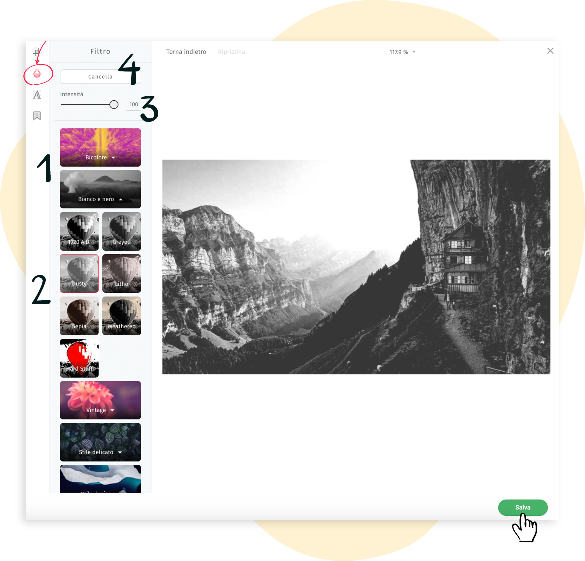 Nell’editor di immagini sono disponibili oltre 60 filtri per i tuoi file immagine. Per accedere ai filtri clicca sulla seconda icona nella barra laterale sinistra: