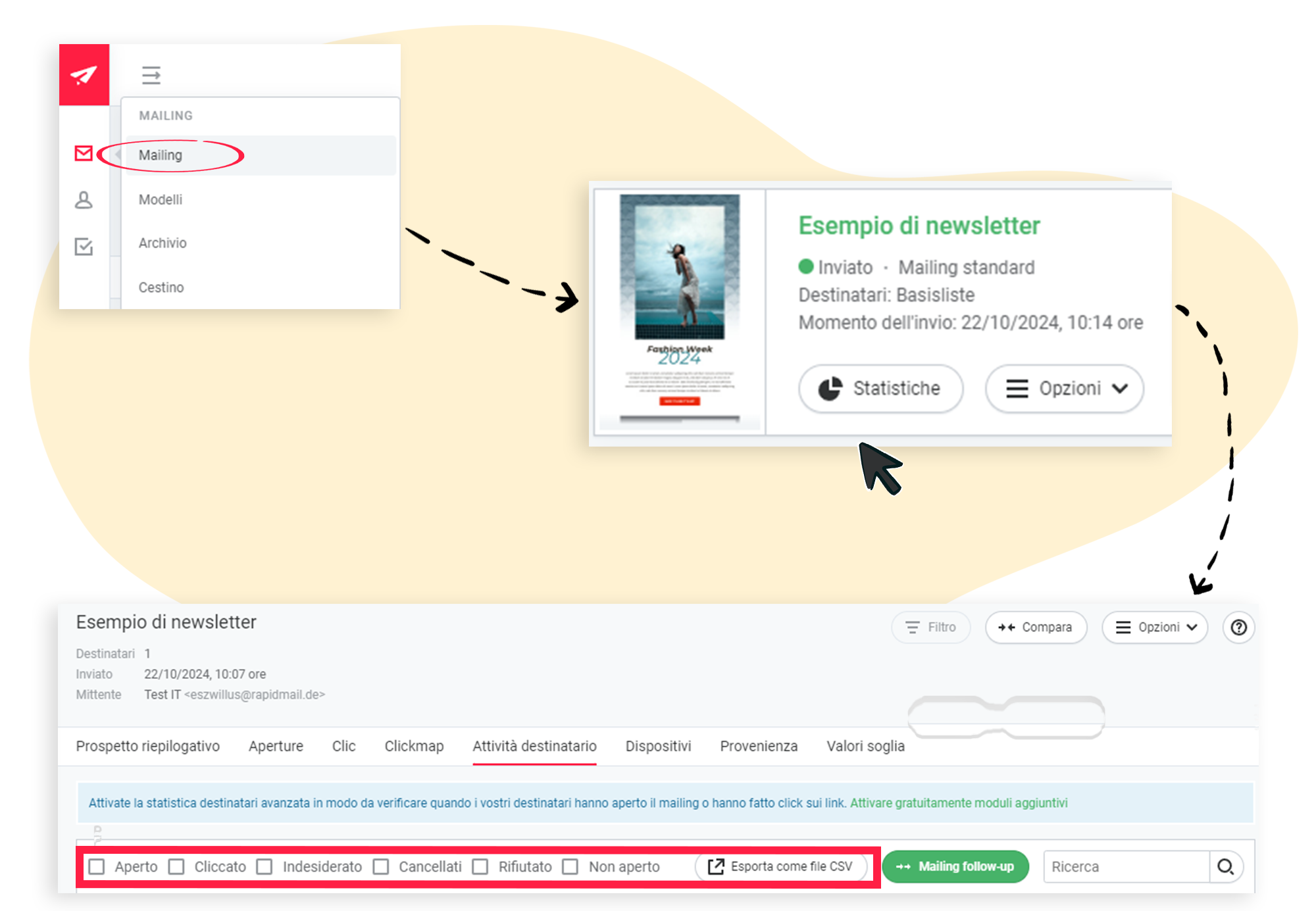 Nelle statistiche di una newsletter puoi vedere quali destinatari hanno aperto, cliccato e rifiutato la newsletter, nonché chi si è cancellato. Con pochi clic puoi esportare una o più categorie. Ti mostriamo come fare.