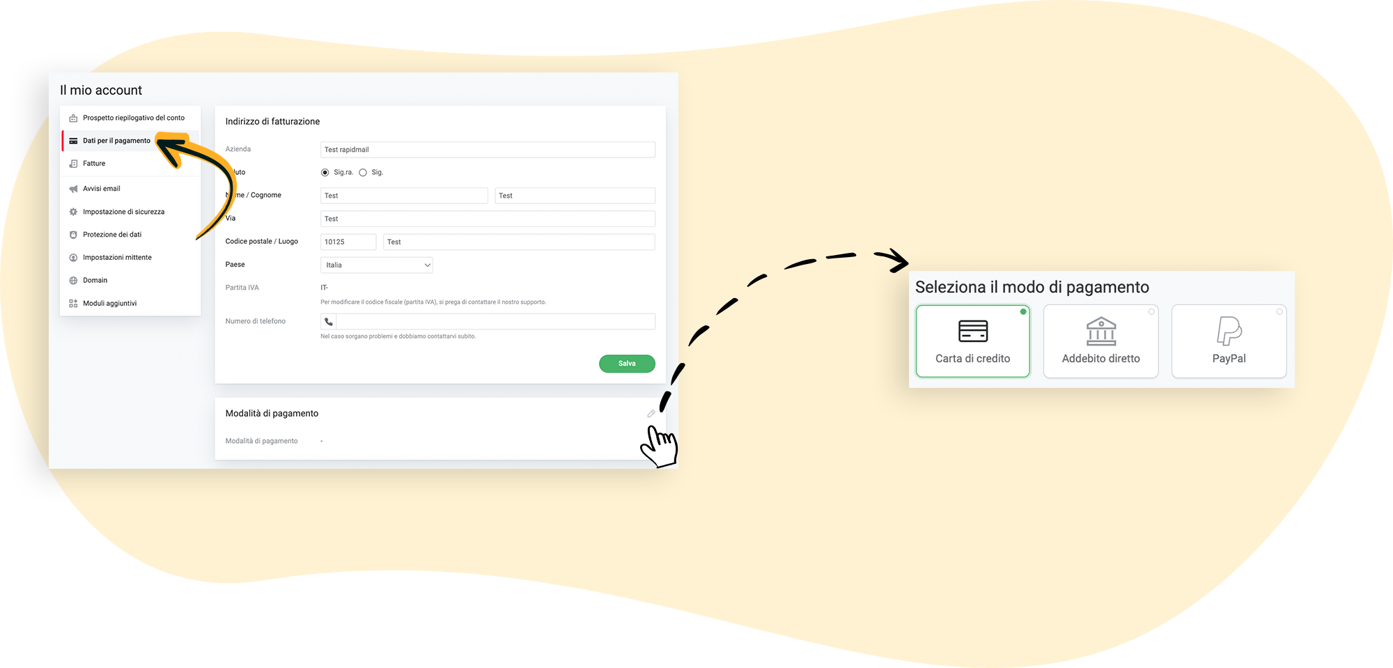 Dalle Impostazioni account puoi aggiornare autonomamente l’indirizzo di fatturazione e il metodo di pagamento all’interno della voce di menu “Dati per il pagamento” sulla sinistra.
