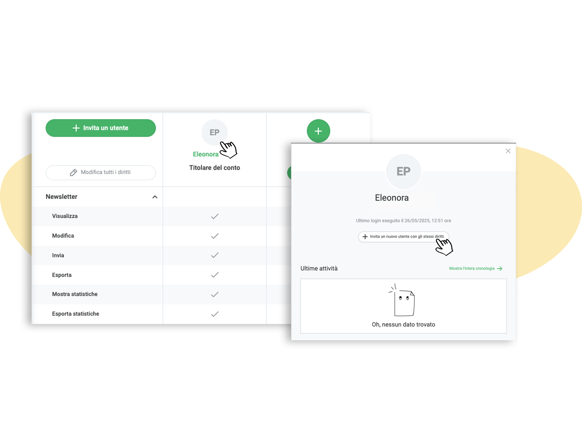 È possibile associare lo stesso utente a più account, consentendogli di passare da uno all'altro con un semplice clic, senza dover eseguire nuovamente il login. Questo rende più efficiente la gestione delle attività, in particolare per le agenzie che curano più newsletter o progetti contemporaneamente.