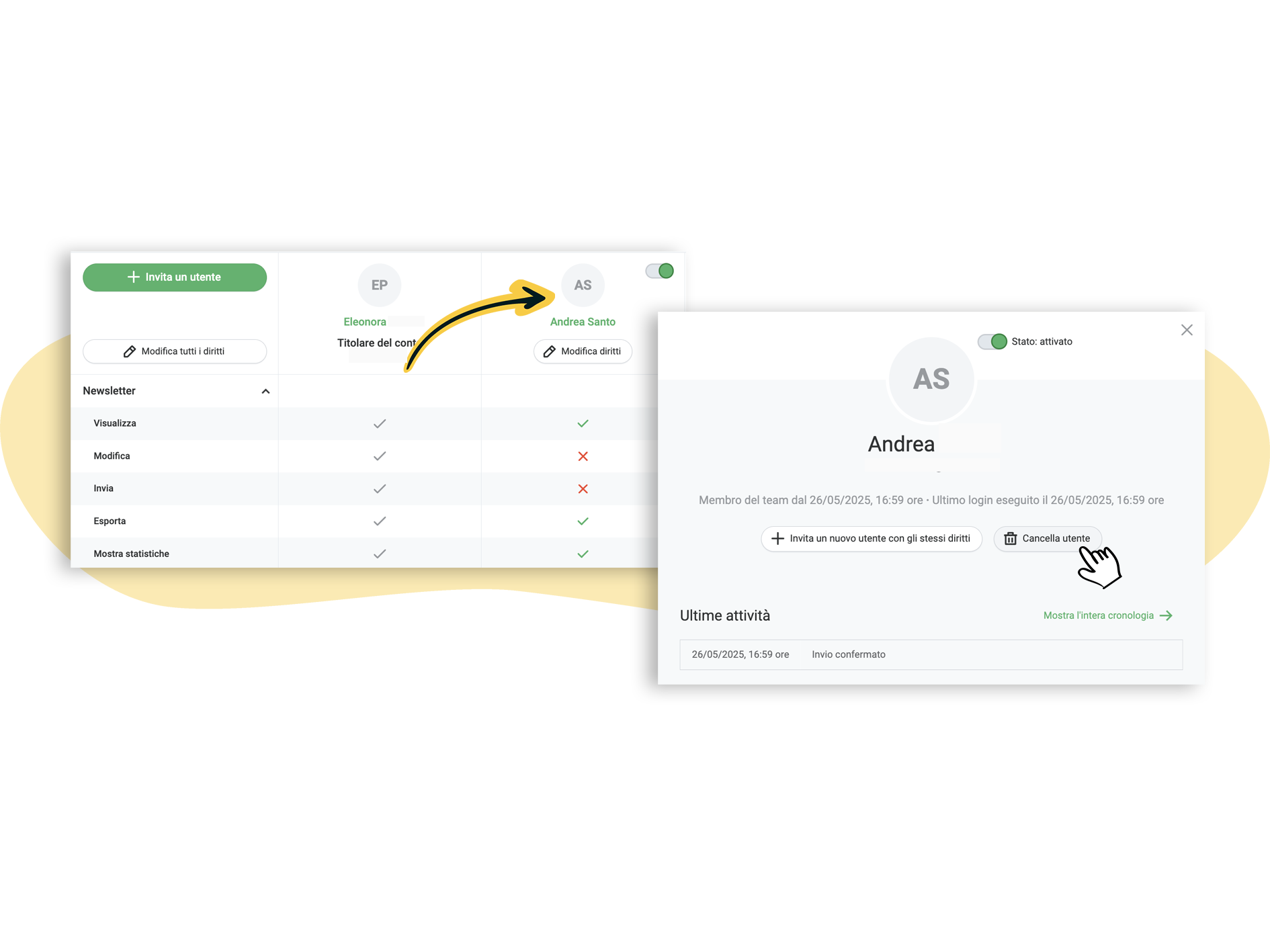 Se necessario, puoi consultare la cronologia delle attività degli utenti per sapere chi ha fatto cosa. Troverai informazioni su tutte le azioni rilevanti: modifica o invio di newsletter, creazione di liste, importazione di contatti, ecc.
