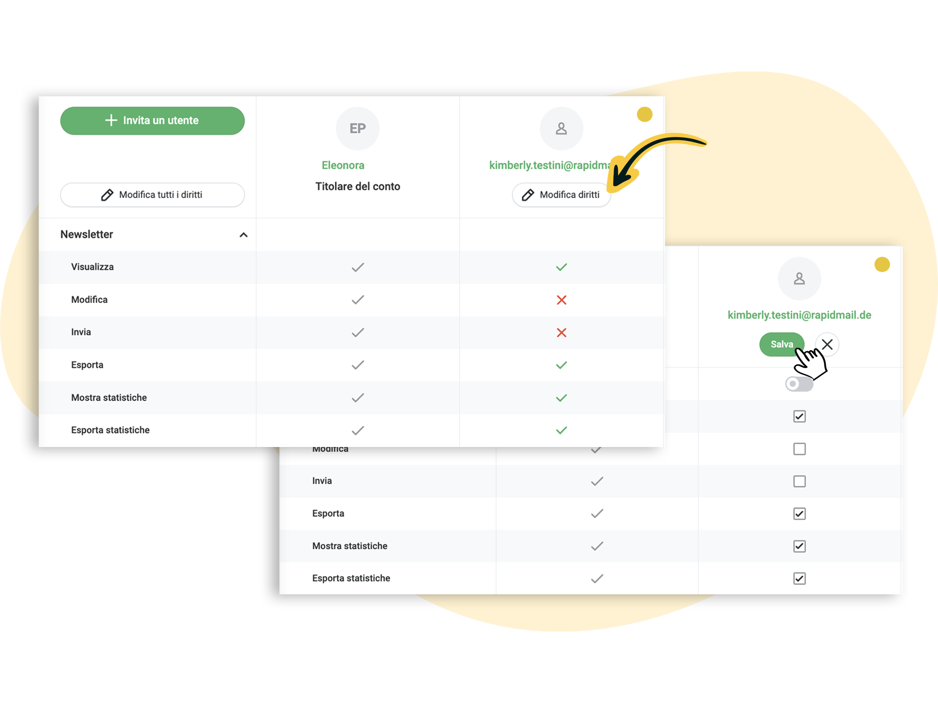 Con la gestione utenti puoi invitare altri utenti nel tuo account rapidmail e assegnare loro diversi livelli di accesso per l'invio delle newsletter.