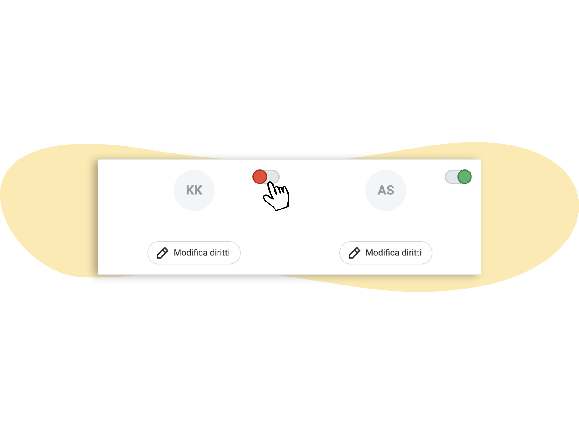 Per disattivare un utente (senza eliminarlo), basta cliccare sull’interruttore accanto al suo nome. Se l’interruttore è rosso, l’utente è disattivato e non può più accedere all’account.
