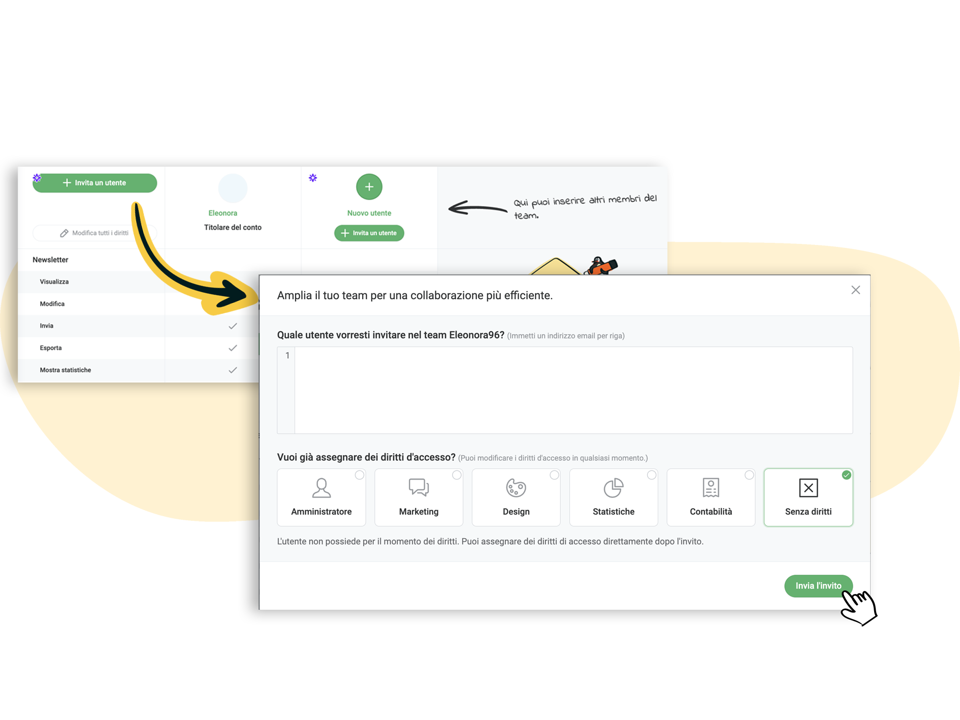 Nota: Puoi invitare più utenti contemporaneamente inserendo più indirizzi email uno sotto l’altro. Ricorda che a tutti verranno assegnati gli stessi diritti di accesso.