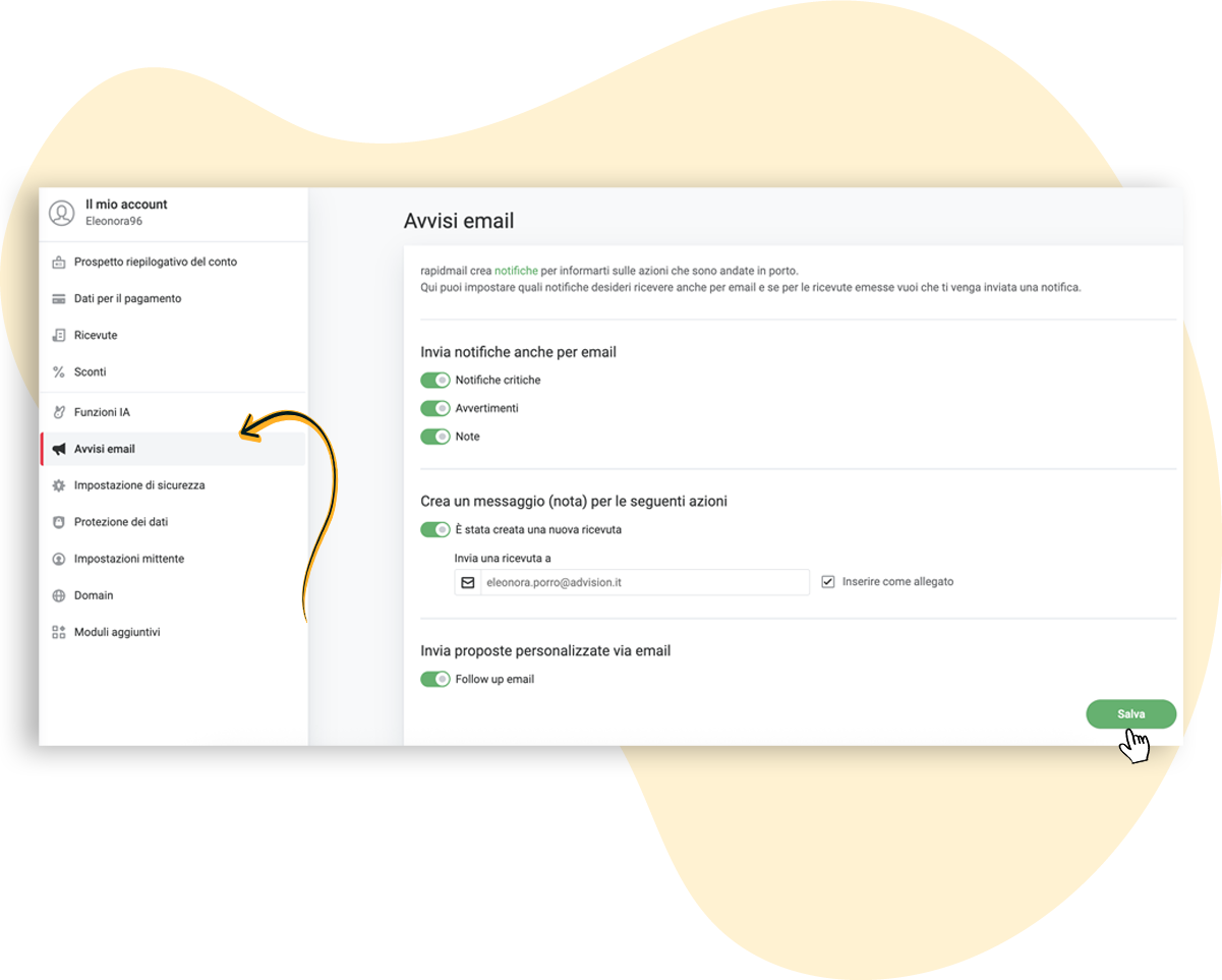 Nel menu di sinistra, seleziona la voce Avvisi email. Da qui puoi configurare le tue preferenze: ad esempio, scegliere se ricevere avvisi critici, notifiche di sistema o le fatture via email.