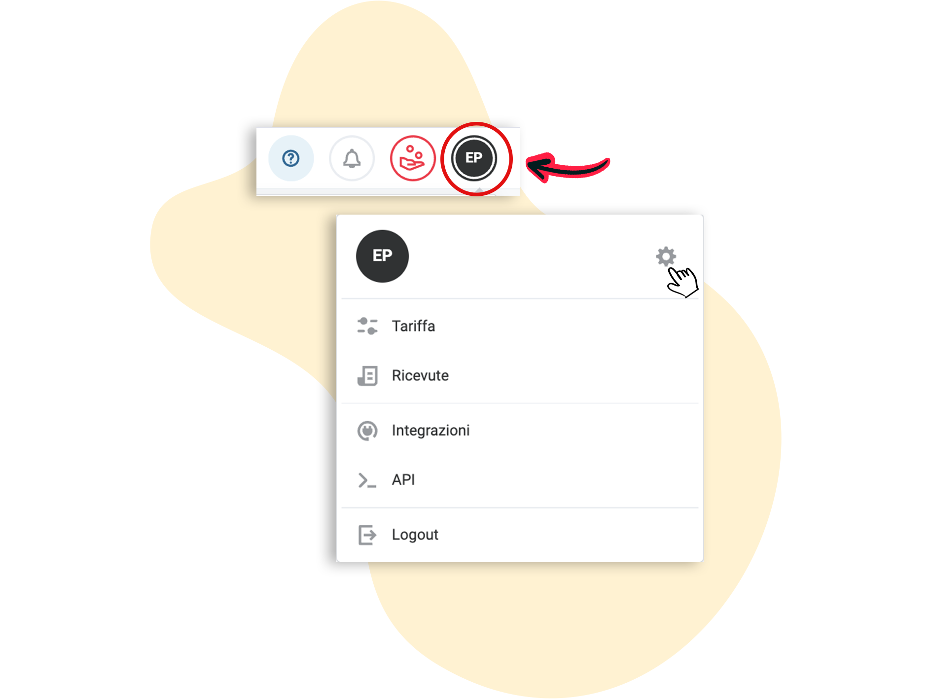 Entra nel tuo account rapidmail e clicca sulla tua sigla in alto a destra, quindi sull’icona a forma di ingranaggio per aprire le impostazioni del tuo account.