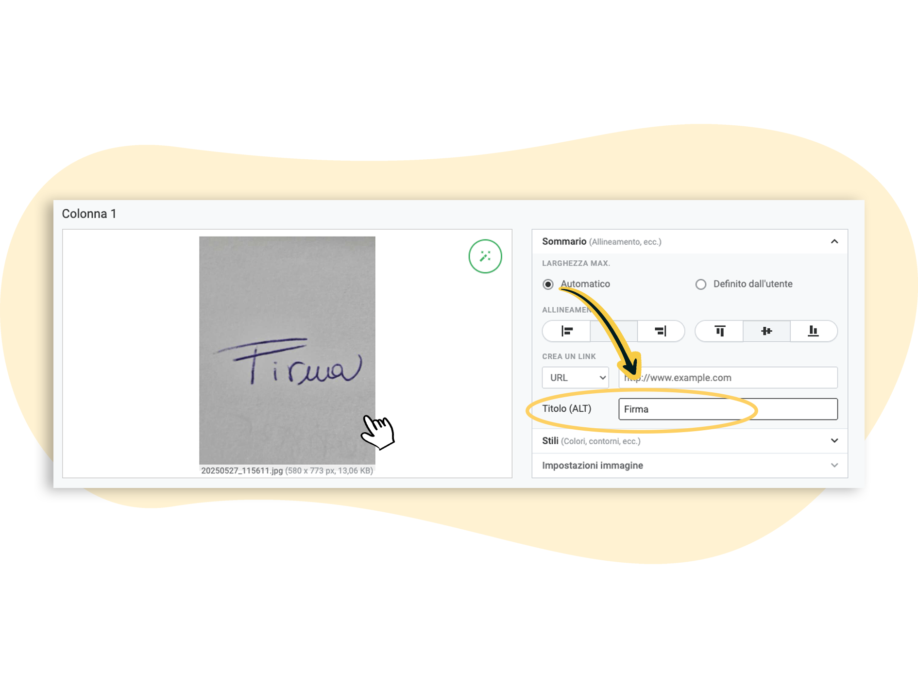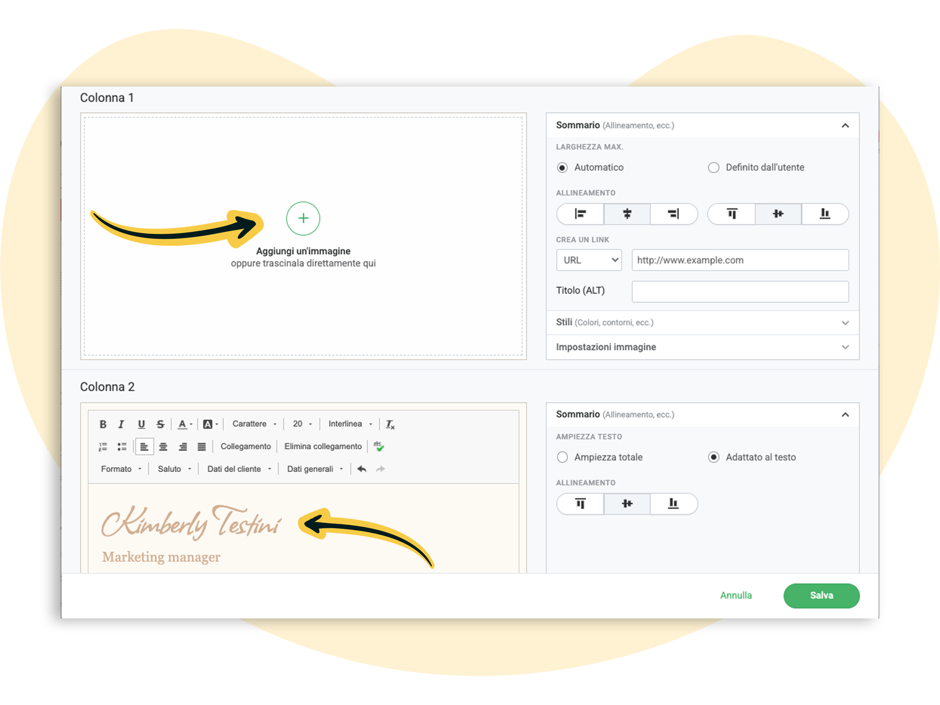 ❗ Allinea sia l’immagine che il testo a sinistra, così la firma apparirà sopra al nome, proprio come in una lettera tradizionale.
