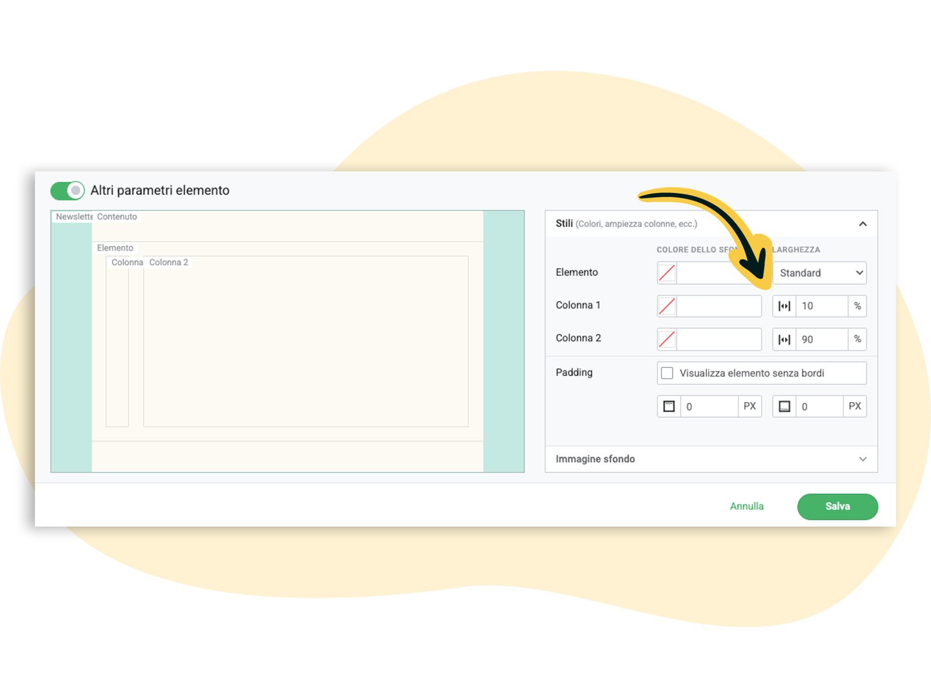 Nelle impostazioni avanzate dell'elemento puoi regolare la larghezza della colonna. Per ottenere l'effetto desiderato (foto piccola con la firma accanto), imposta la larghezza della colonna 1 al 10 % e quella della colonna 2 al 90 %. Infine, fai clic su Salva per inserire la firma nella newsletter.