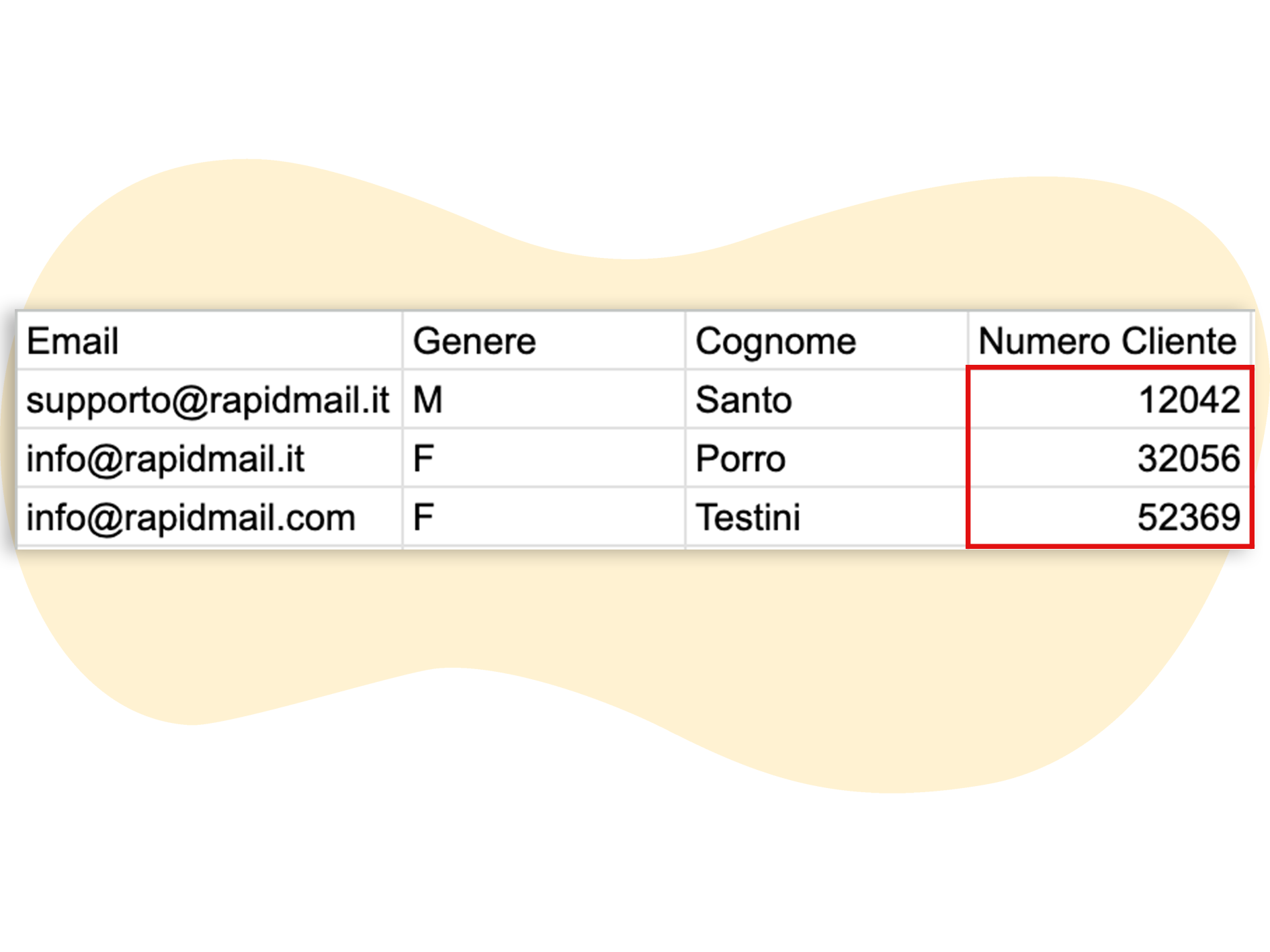 La parte statica, che non cambia, è http://www.rapidmail.it/cliente/. La parte dinamica è il numero cliente (nell’esempio sopra evidenziato). I dati dei destinatari, che hai già importato, potrebbero apparire in questo modo: