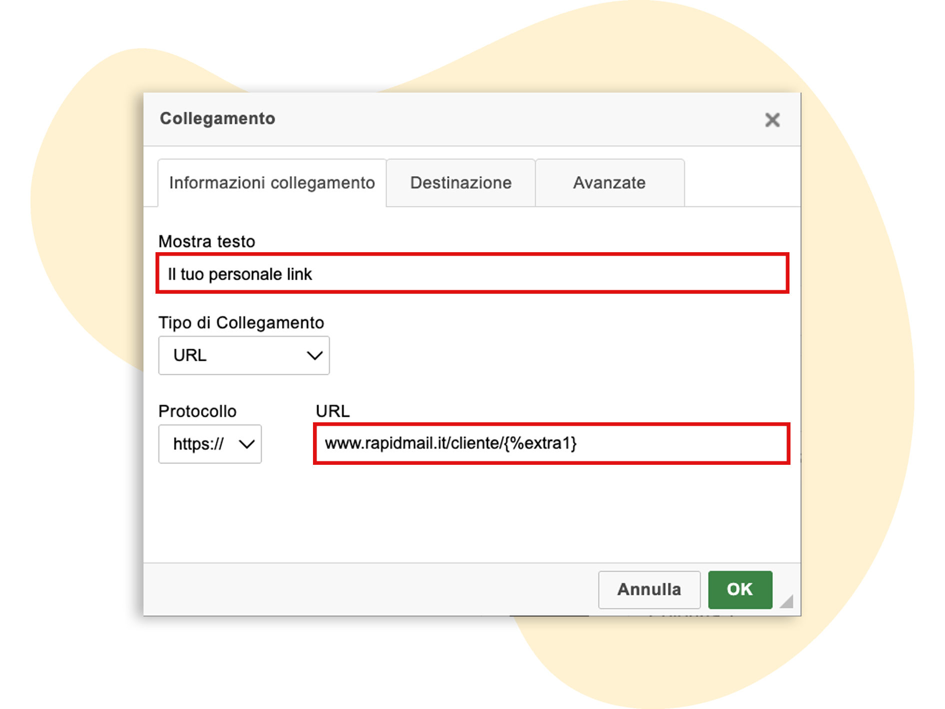 Nell’esempio, abbiamo collegato il testo “Il tuo personale link”. La stessa procedura vale anche se vuoi inserire un link su un’immagine. La URL sarà diversa per ogni destinatario.