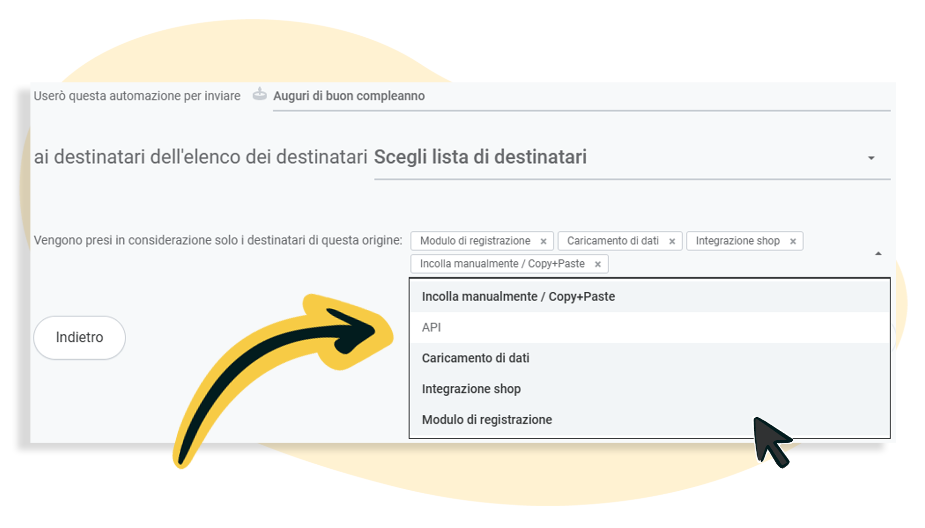 Dopo aver selezionato l'elenco dei destinatari e aver impostato se l'automazione è destinata solo ai contatti di un segmento specifico o con un'etichetta specifica, è possibile impostare l'origine del destinatario nell'ultima riga.