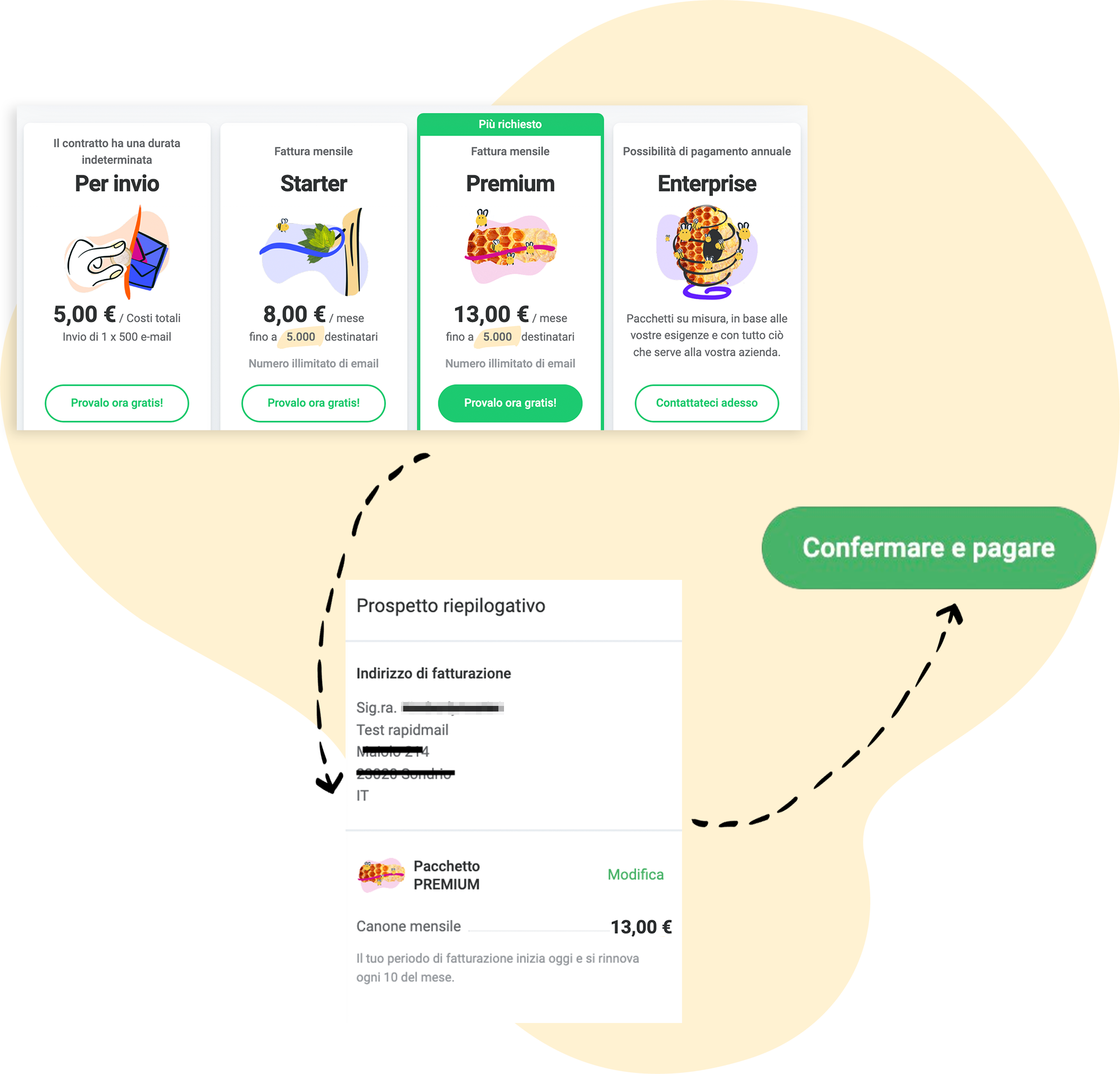 se hai intenzione di passare a un pacchetto più piccolo potresti non avere a disposizione tutte le funzioni. Ad esempio, potrebbe essere necessario ridurre la quantità degli elenchi destinatari, dei moduli di iscrizione e disiscrizione o degli indirizzi del mittente memorizzati prima del cambio, poiché i limiti variano a seconda dei diversi pacchetti. A tal proposito, riceverai naturalmente un avviso in anticipo: nulla verrà eliminato senza informarti prima.