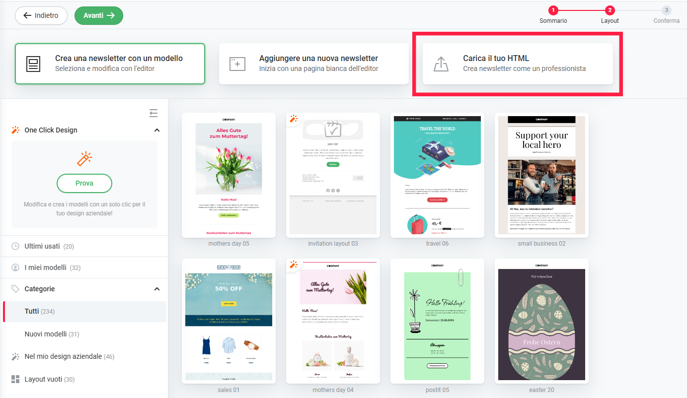 Caricalo in una nuova bozza di newsletter selezionando "Carica il tuo HTML":