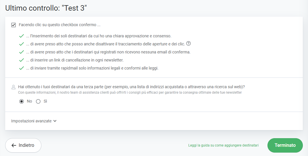Ora sei all'ultima fase e puoi dare un'ultima occhiata all'elenco dei destinatari. Seleziona la casella “Facendo clic su questo checkbox, confermo...”.