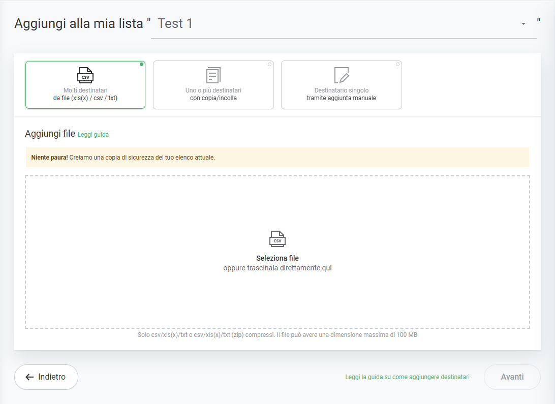 Seleziona "Molti destinatari", carica il file CSV e clicca su "Avanti":