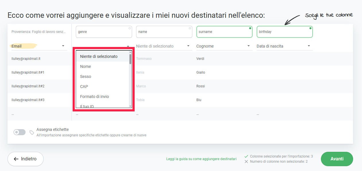 rapidmail riconosce automaticamente i campi principali come email, nome, cognome, genere e CAP.