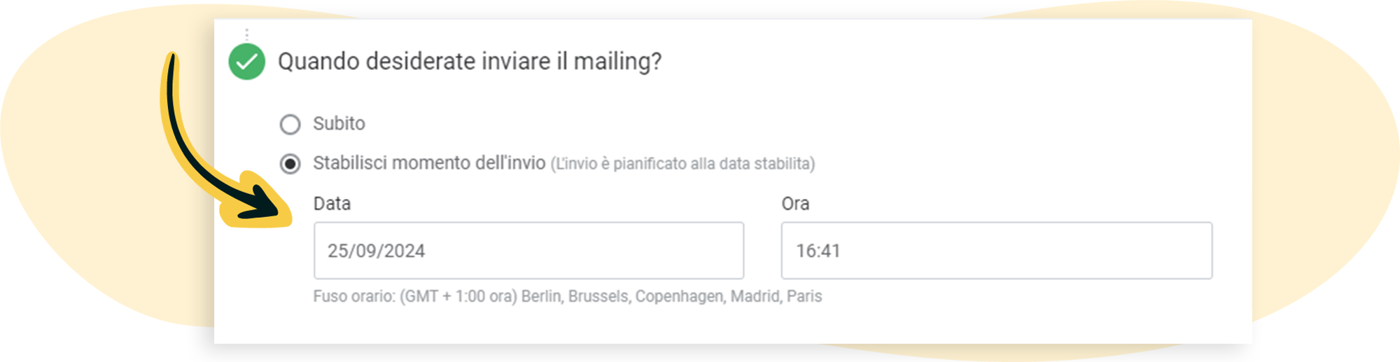 - Definisci momento di invio: decidi tu stesso quando la newsletter deve arrivare ai tuoi contatti. Qui hai la possibilità di impostare la data e l’ora che desideri.