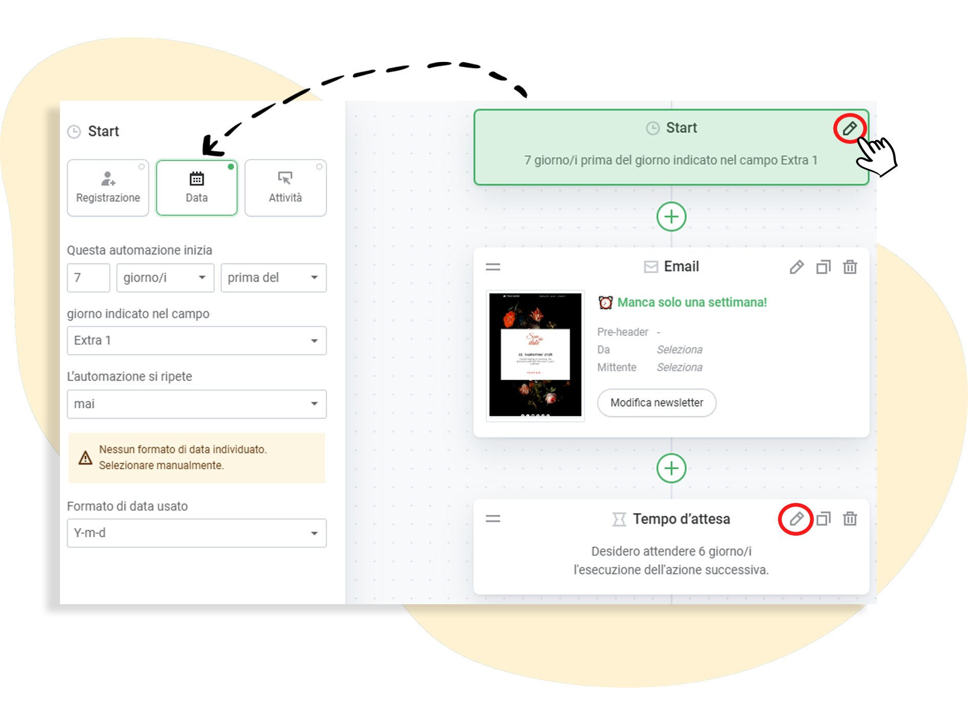 Nun beginnt das Bearbeiten der Automationsstrecke: Bereits vorhanden ist die Ora è possibile iniziare a modificare la sequenza di automazione: la condizione di inizio è già disponibile. L'impostazione automatica predefinita prevede un promemoria 7 giorni e un giorno prima del rispettivo evento. Se si desidera modificarla, fare clic su ✏️ e modificare i dettagli.