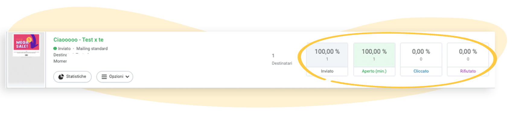 Il tasso di consegna (Inviato) mostra quante newsletter sono effettivamente giunte nella posta in arrivo dei tuoi contatti. Se, ad esempio, la newsletter è stata inviata a un indirizzo email non attivo, lo si vede nel tasso di consegna. Il tasso di consegna fa quasi da contraltare al tasso di rimbalzo ed è altrettanto importante per la tua reputazione.