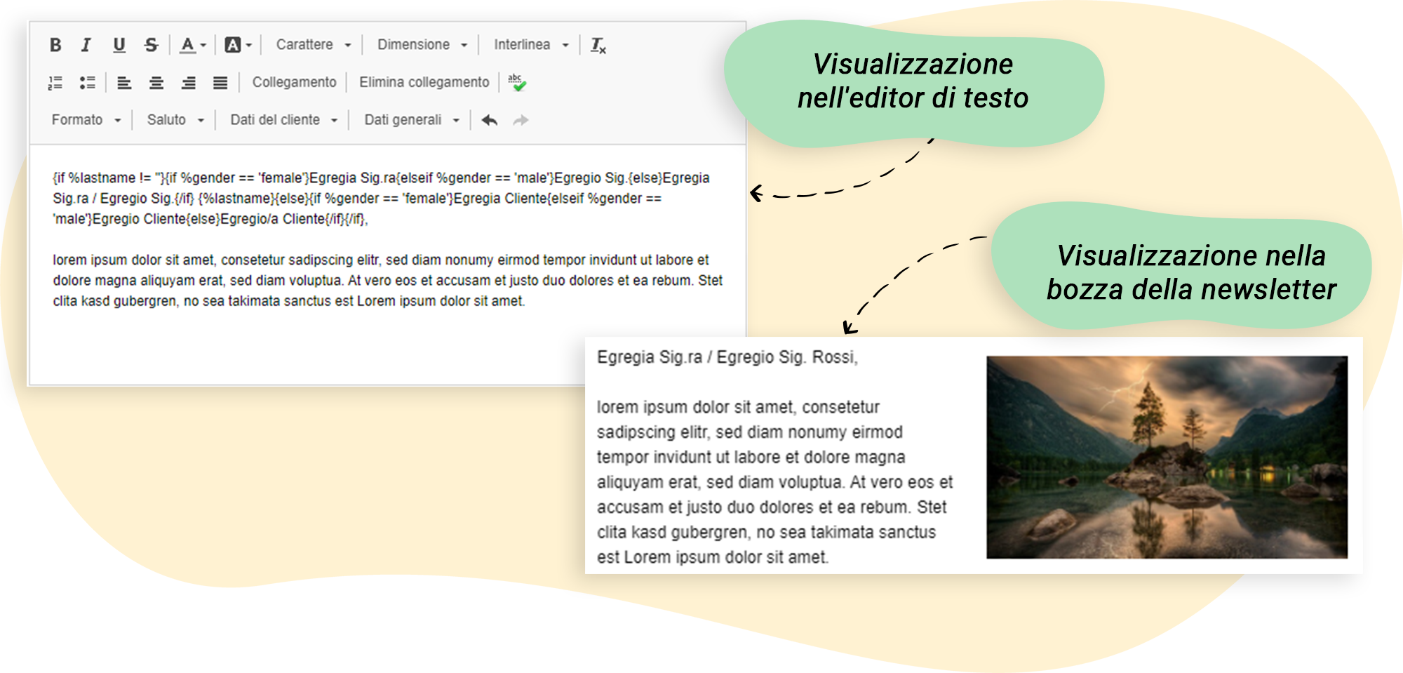 🧐 La formula di saluto che compare nel campo di testo contiene una serie di parametri. Questi parametri vengono sostituiti al momento del salvataggio da dati di contatti generici e al momento dell’invio della newsletter automaticamente con i dati individuali dei destinatari: non si tratta dunque di una rappresentazione effettiva di quello che sarà inviato nella newsletter.