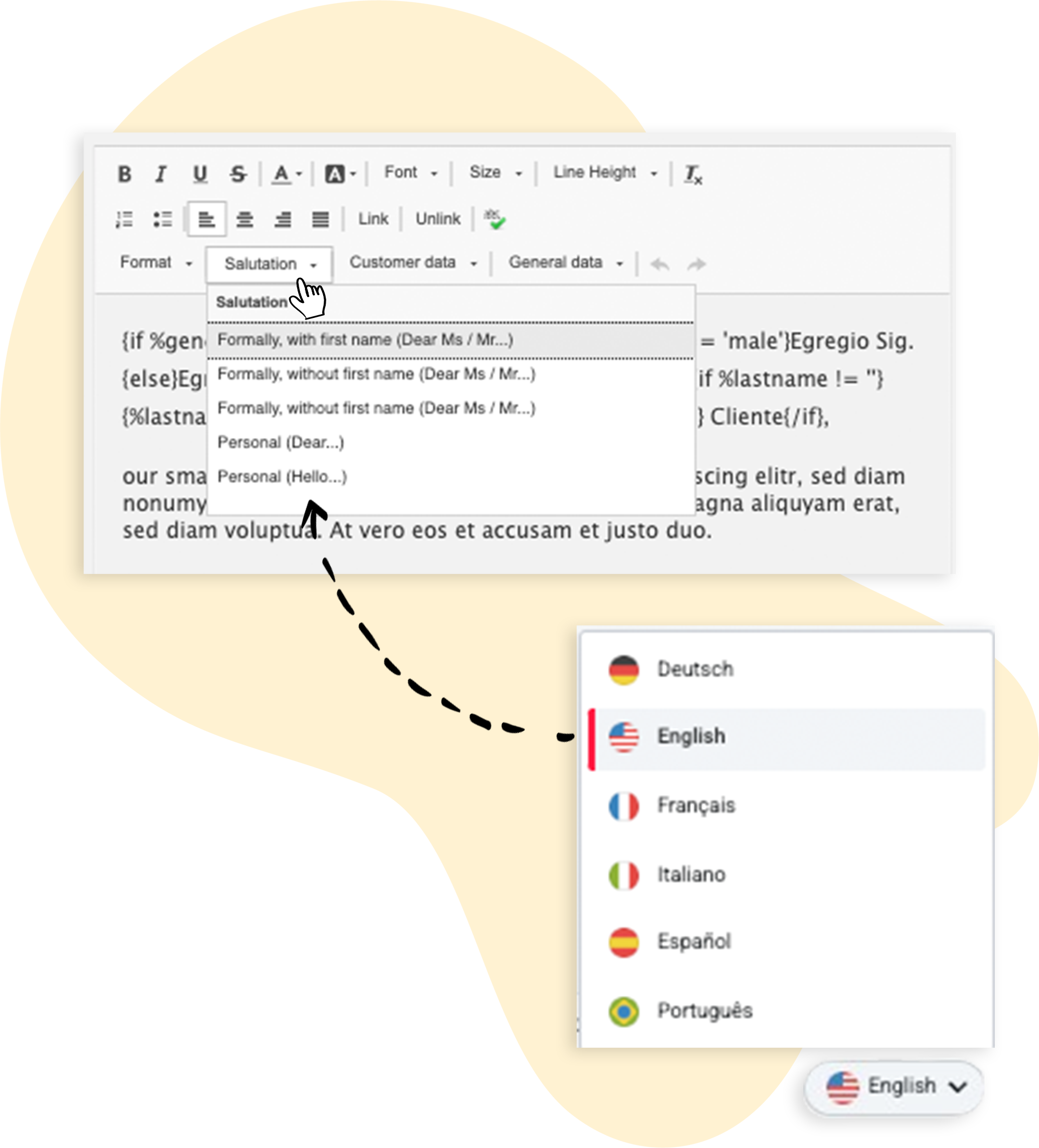 Prima di aggiungere il tuo elemento di testo, in basso a destra seleziona la lingua desiderata, ad es. l’inglese. Le fasi successive sono quelle descritte al punto 2: aggiungi l’elemento di testo con Drag and Drop e cerca il saluto desiderato nell’omonimo campo (in inglese: Salutation). Anche in questo caso puoi scegliere tra saluti formali e informali.