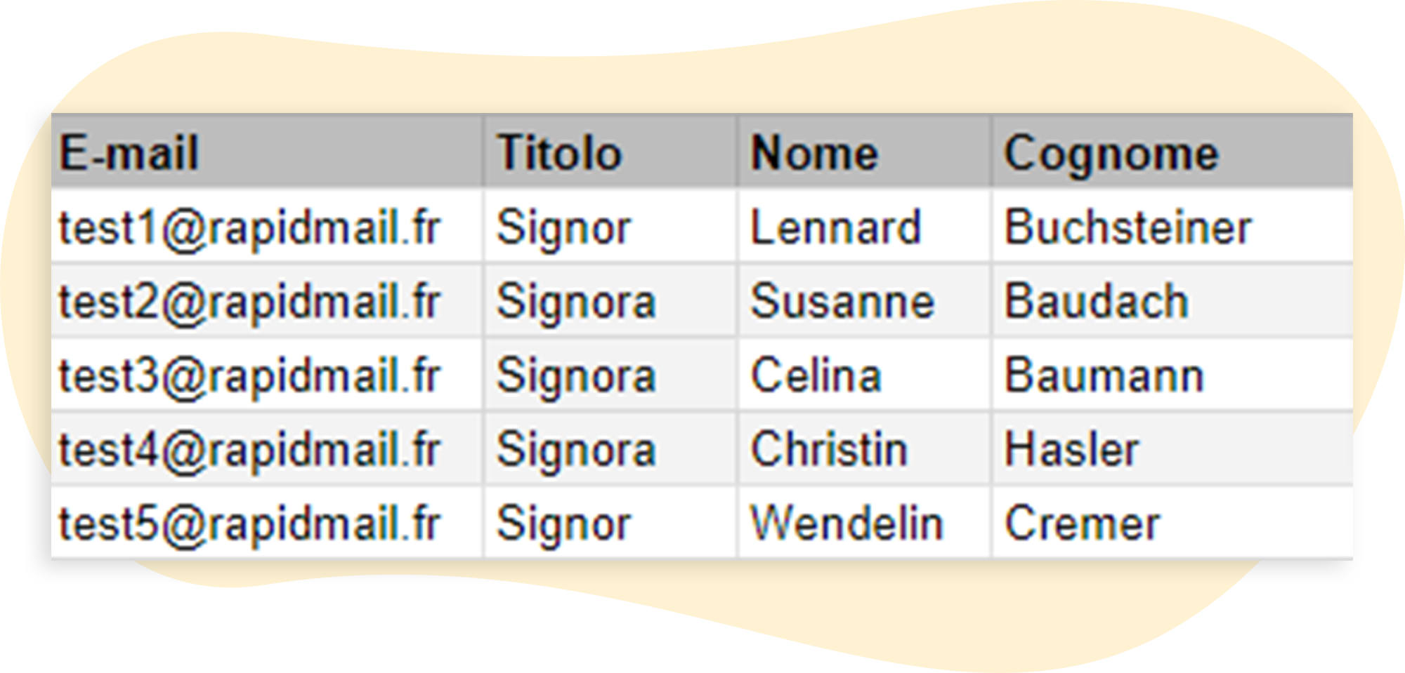 Solitamente queste informazioni sono contenute direttamente nel file di importazione che carichi in rapidmail quando crei l’elenco destinatari. Per fare ciò, basta creare le colonne corrispondenti nella tua tabella.