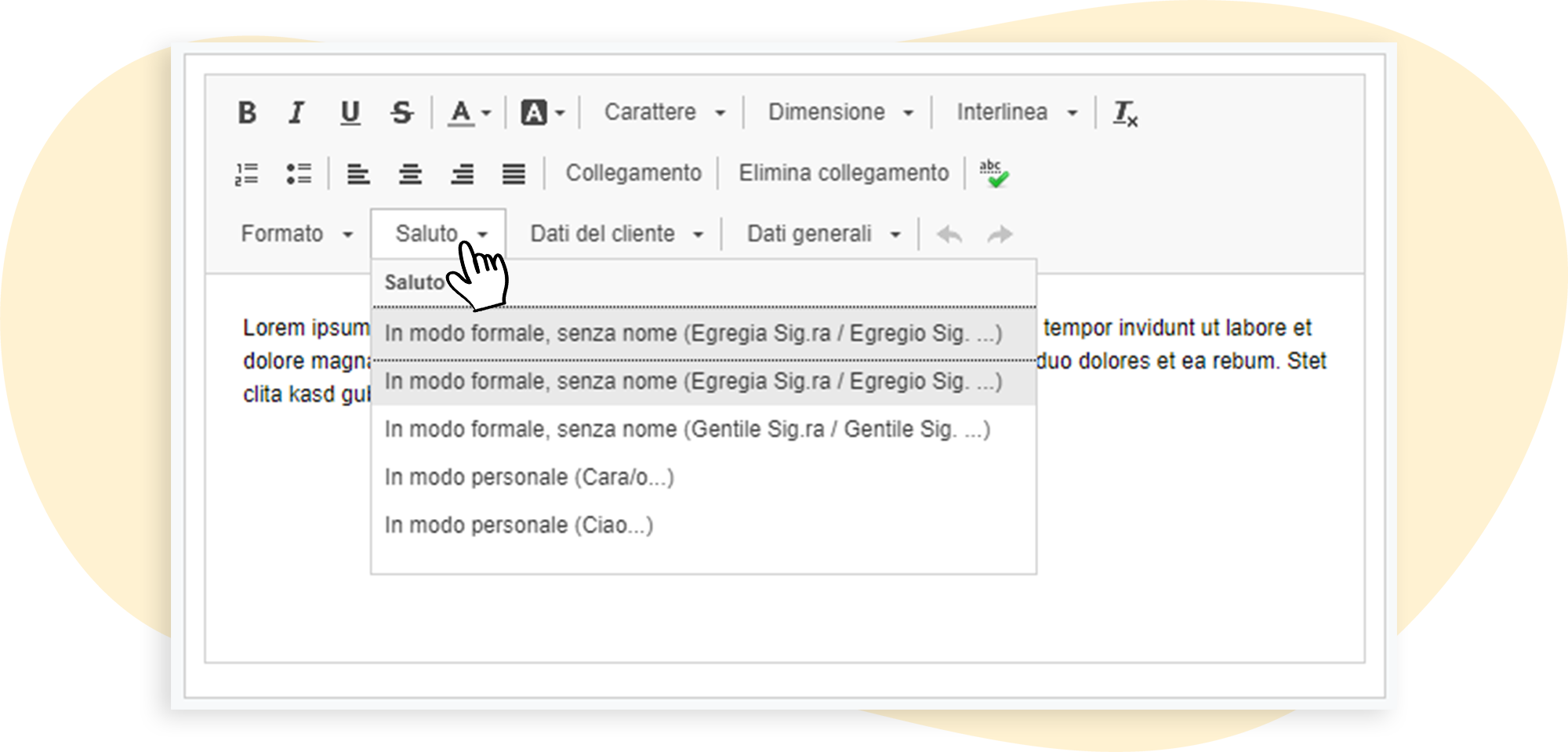 Per incorporare il saluto nelle tue email basta inserire nell’editor un elemento di testo. Nelle opzioni di formattazione trovi l’opzione “Saluto”. Clicca su questa opzione per visualizzare le varie possibilità di saluto: sono disponibili sia formulazioni formali che personali, in modo da poter adattare il saluto al tuo gruppo di riferimento.