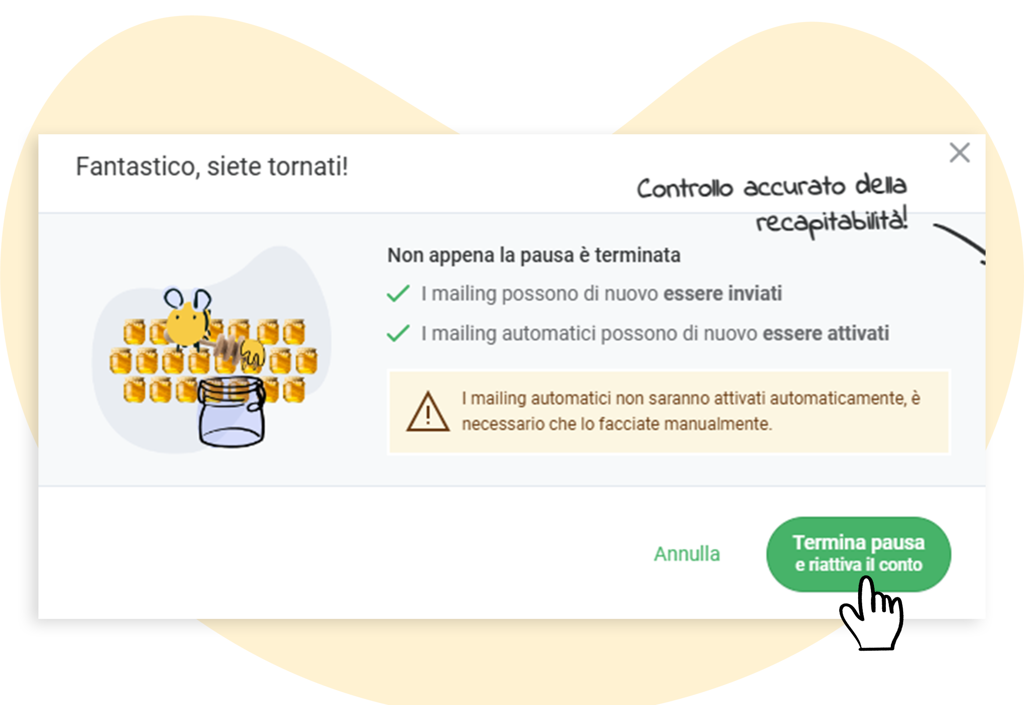 Fai clic sul pulsante verde per la conferma. La sospensione termina con effetto immediato e puoi riprendere l’invio di newsletter.