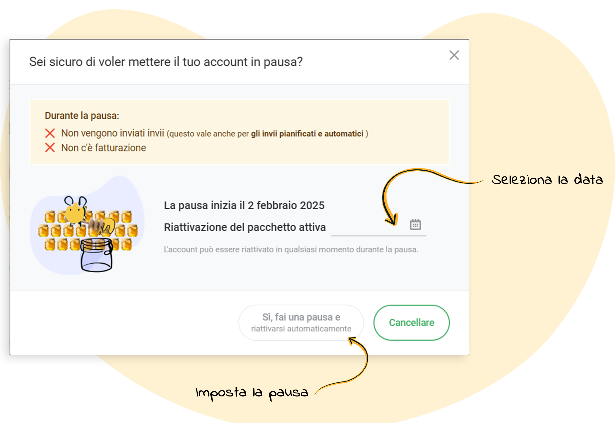 Se hai bisogno di interrompere temporaneamente l’invio delle newsletter, questo articolo ti spiega come sospendere il tuo pacchetto mensile. Durante la sospensione, tieni presente che non verranno inviate newsletter, incluse le email pianificate e quelle automatiche.