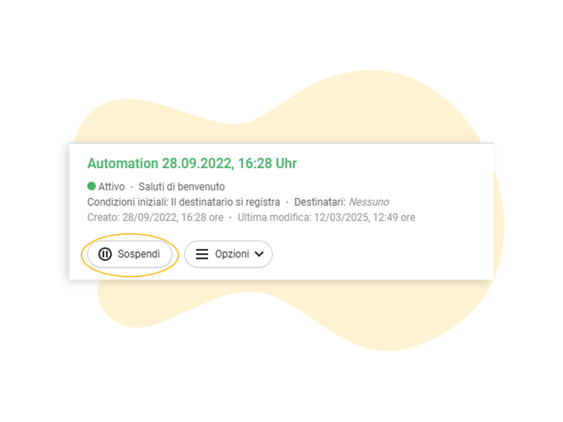 A tale scopo, fare clic sul pulsante Chiudi a sinistra e richiamare l'area Obsoleto > Email automatiche nel menu di navigazione. L'opzione di sospensione si trova nelle impostazioni dell'automazione