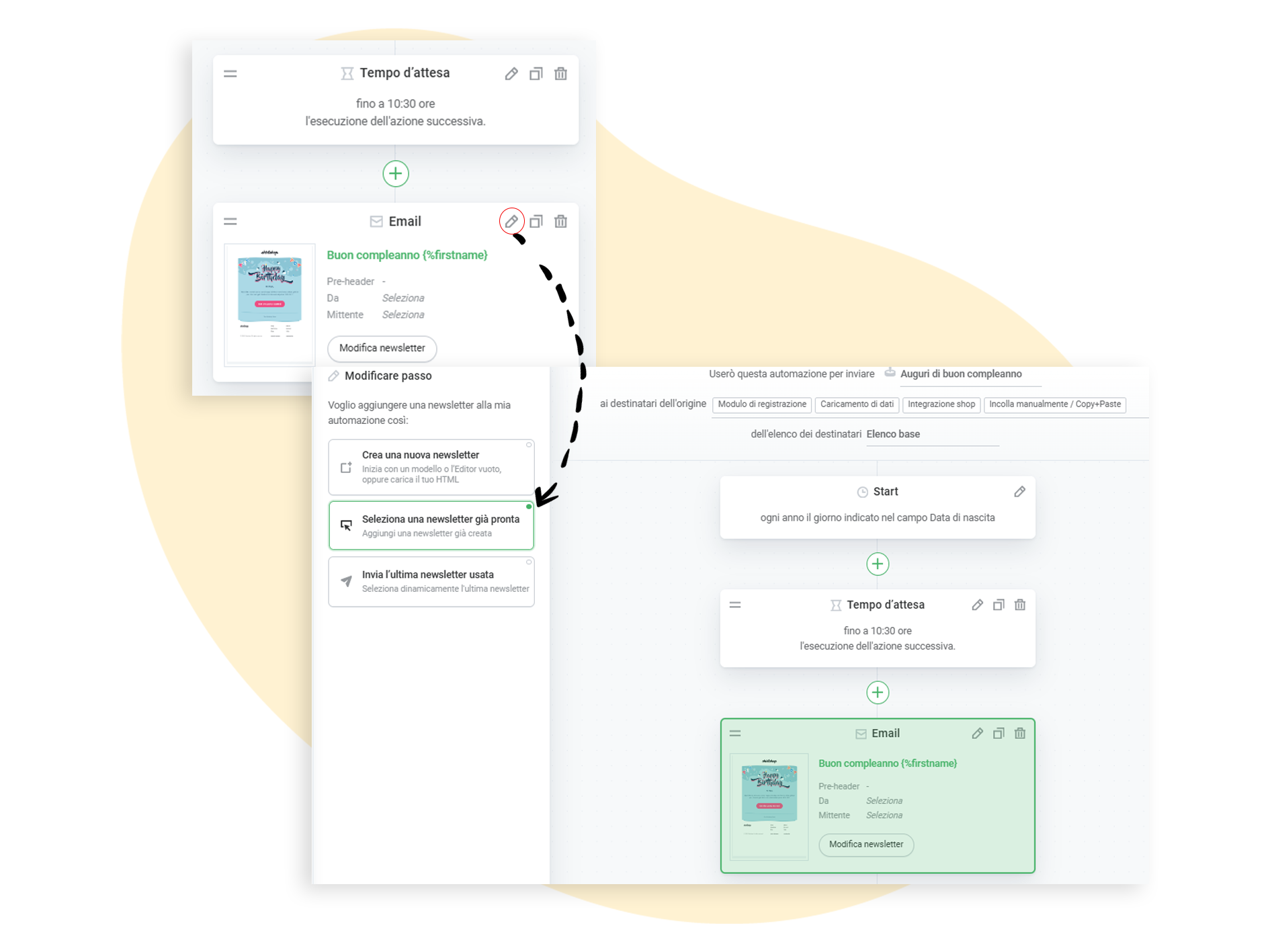 Ogni serie di automazioni contiene già almeno una newsletter. Se non hai bisogno di questa newsletter nella tua automazione, fai clic sull'icona della matita ✏️ e poi su Seleziona una newsletter già pronta.