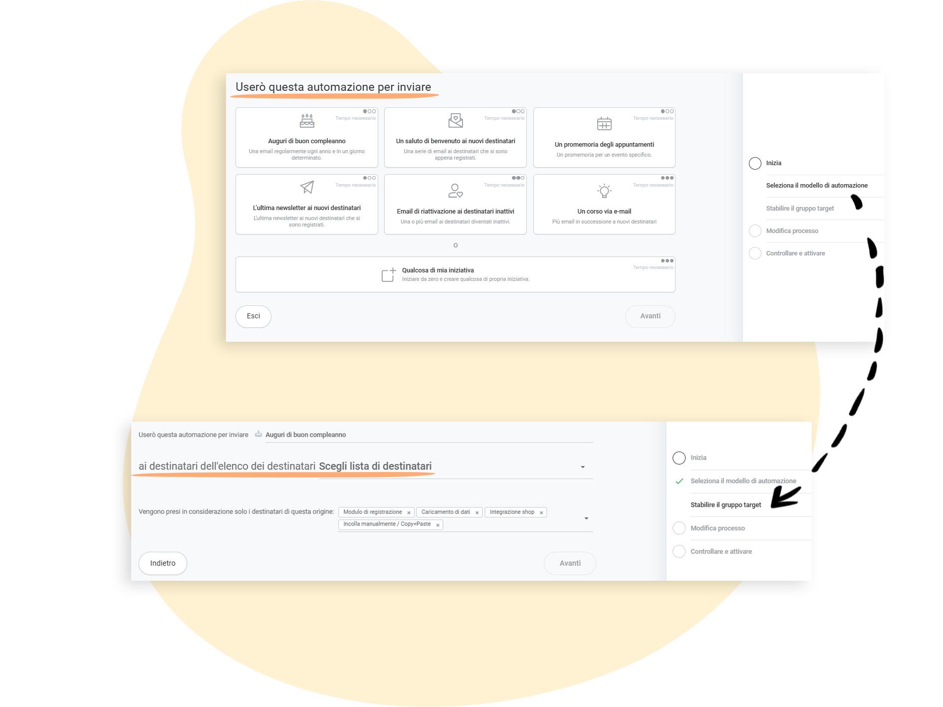 Fase 3: Poi seleziona l'elenco dei destinatari e l'origine: è qui che si imposta il gruppo di destinatari che si vuole raggiungere con la propria automazione.
