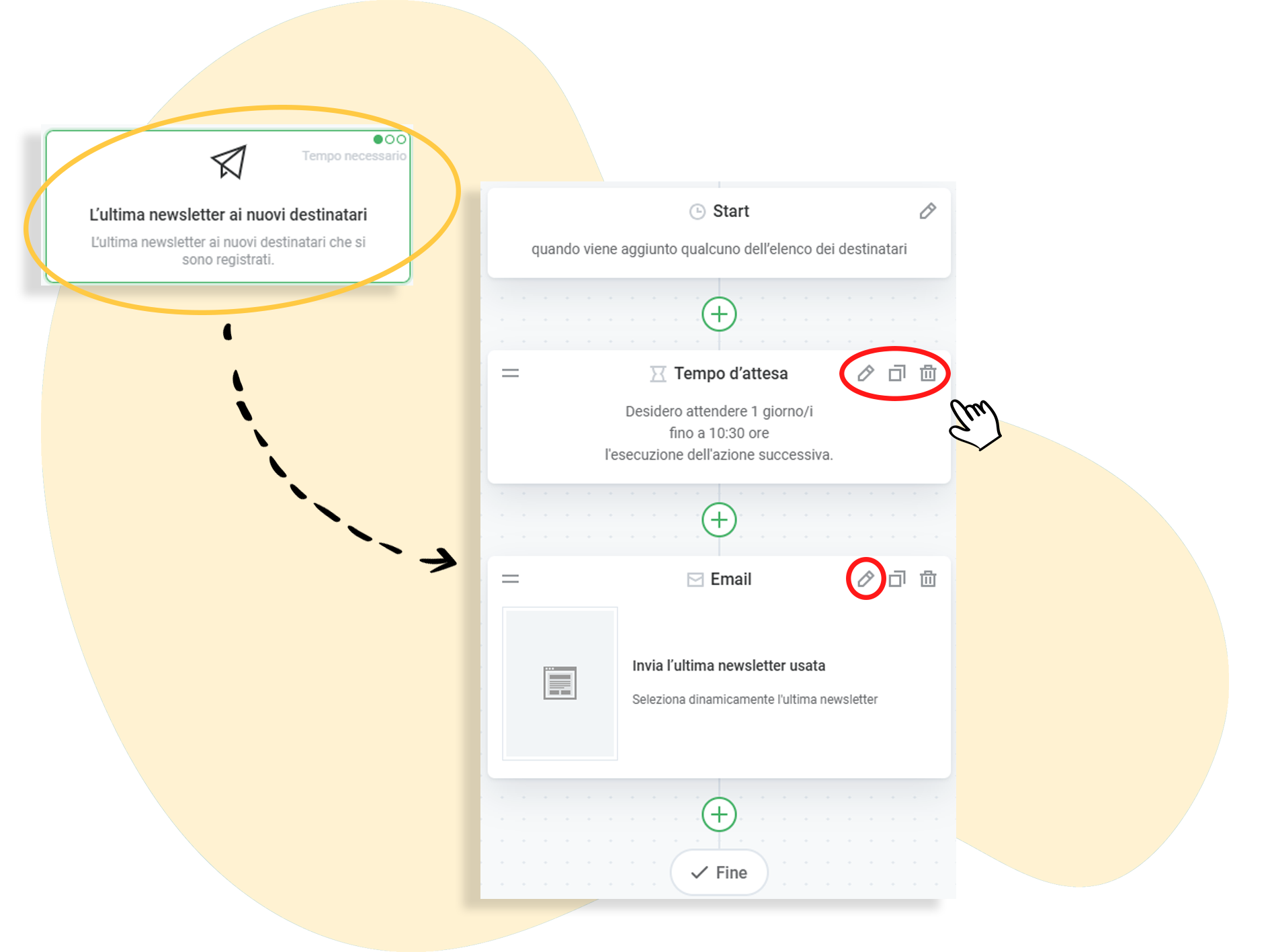 Desideri mandare l'ultima newsletter inviata a contatti che si sono aggiunti alla tua lista di destinatari solo dopo l'invio, ad esempio per colmare il tempo di attesa per la newsletter successiva? Questa automazione ti aiuta a inviare l'ultima newsletter ai nuovi contatti, in modo che non si perdano le ultime novità. La selezione della newsletter avviene sempre in modo dinamico, cioè viene selezionata automaticamente la newsletter inviata più di recente.