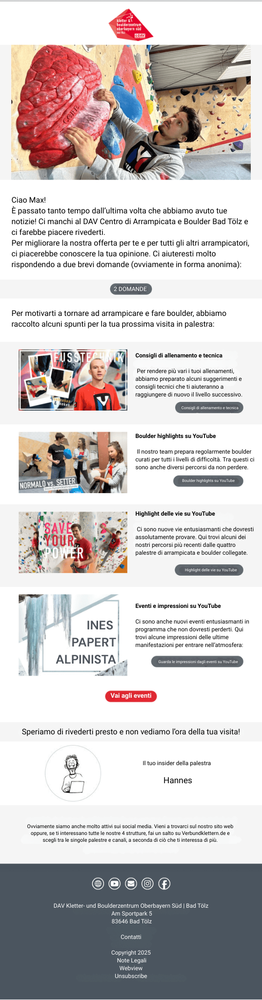 Crea un'email di riattivazioneEsempio di newsletter di riattivazione del centro di arrampicata e bouldering Oberbayern Süd