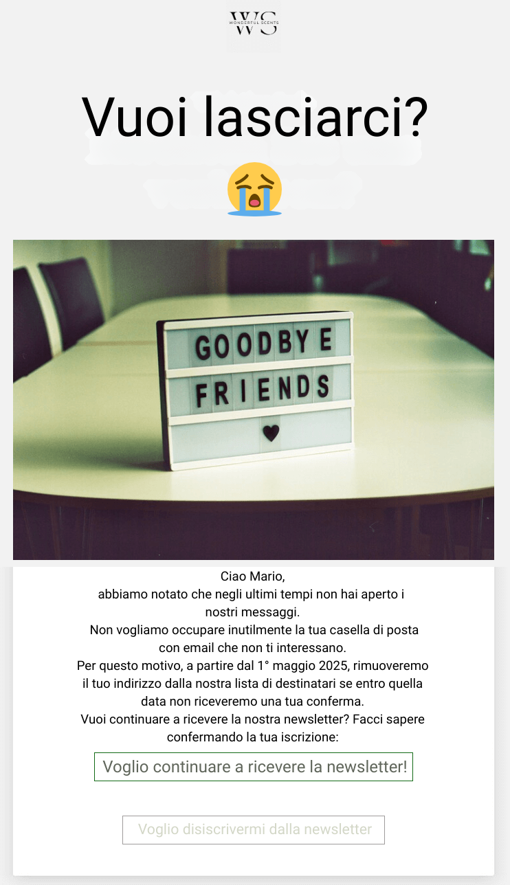 - 😴 Dopo 6 mesi di inattività: Se un contatto resta inattivo per sei mesi, è il momento di tentare un ultimo riavvicinamento. Fai sapere che ti manca e offrigli un’ultima occasione per restare iscritto, con un semplice clic sul pulsante nell’email.
