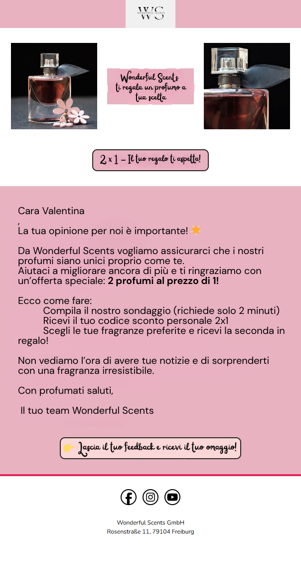 - 🎁 Sconti e codici promozionali: "10% di sconto sul tuo prossimo ordine – solo per pochi giorni!"